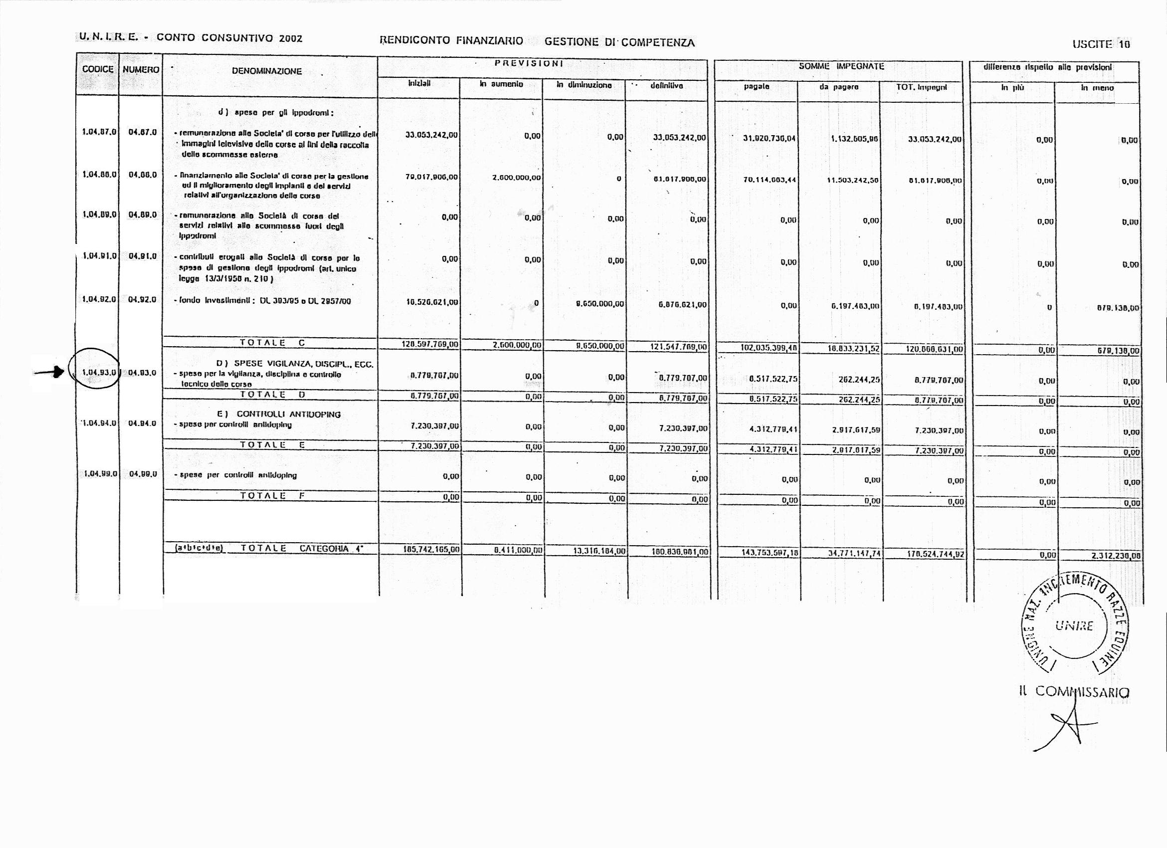 Pubblichiamo, nel file allegato, un estratto dal Conto Consuntivo Unire anno 2002 - "Uscite" dove figura la voce "spese per la vigilanza, disciplina e controllo tecnico delle corse".