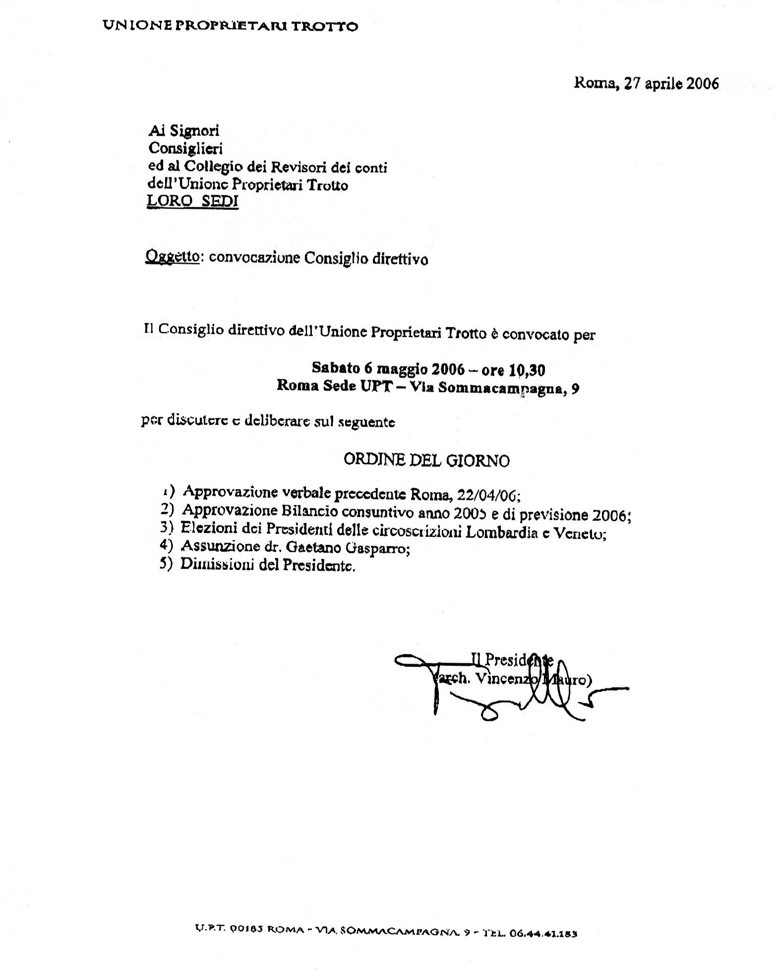 Pubblichiamo, nel file allegato, convocazione Consiglio direttivo Upt del 6 maggio 2006 (quorum non raggiunto), i cui punti all'ordine del giorno sono i medesimi di sabato 27 maggio p.v.