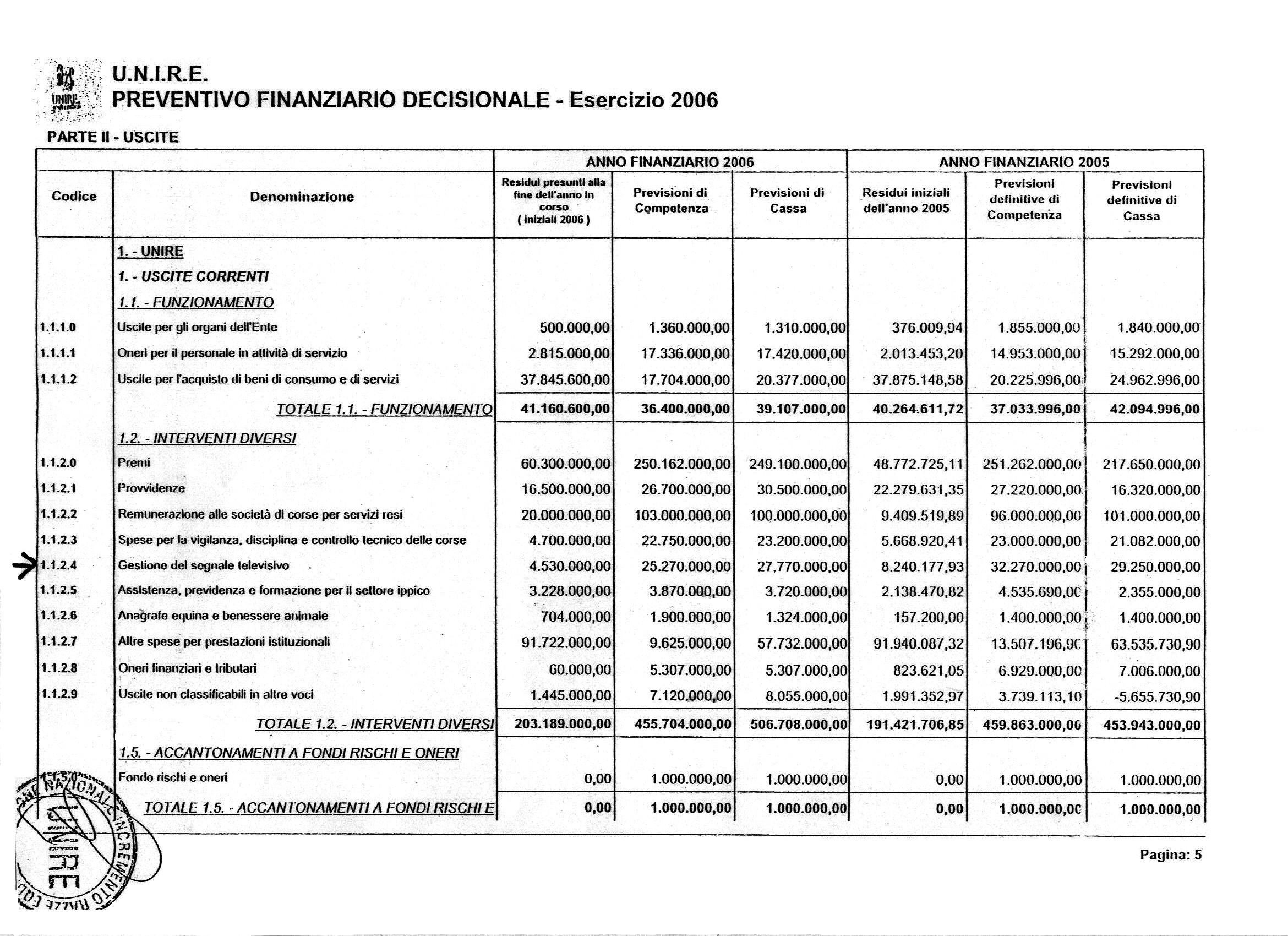 Pubblichiamo, nel file allegato, un estratto del bilancio preventivo finanziario decisionale Unire anno 2006 (pag.5), con evidenziate fra gli "interventi diversi" le uscite per la "gestione del segnale televisivo".