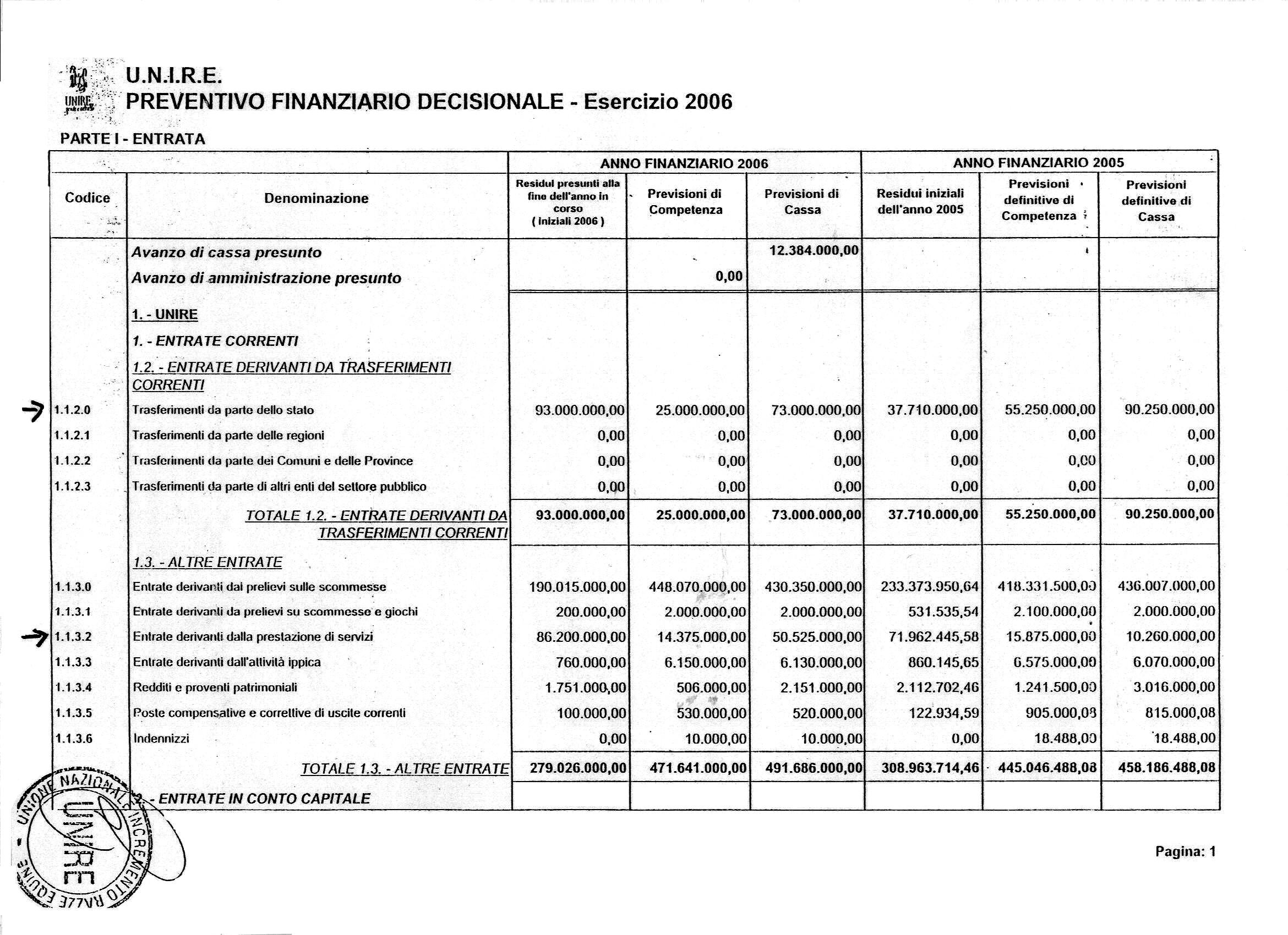 Pubblichiamo, nel file allegato, un estratto del bilancio preventivo finanziario decisionale Unire anno 2006 (pag.1), con evidenziati fra le "entrate correnti" al cap. 1.1.2.0. "trasferimenti da parte dello stato" e al cap. 1.1.3.2 "entrate derivanti dalla prestazioni di servizio" (per la gestione del servizio di ripresa televisiva delle corse). |