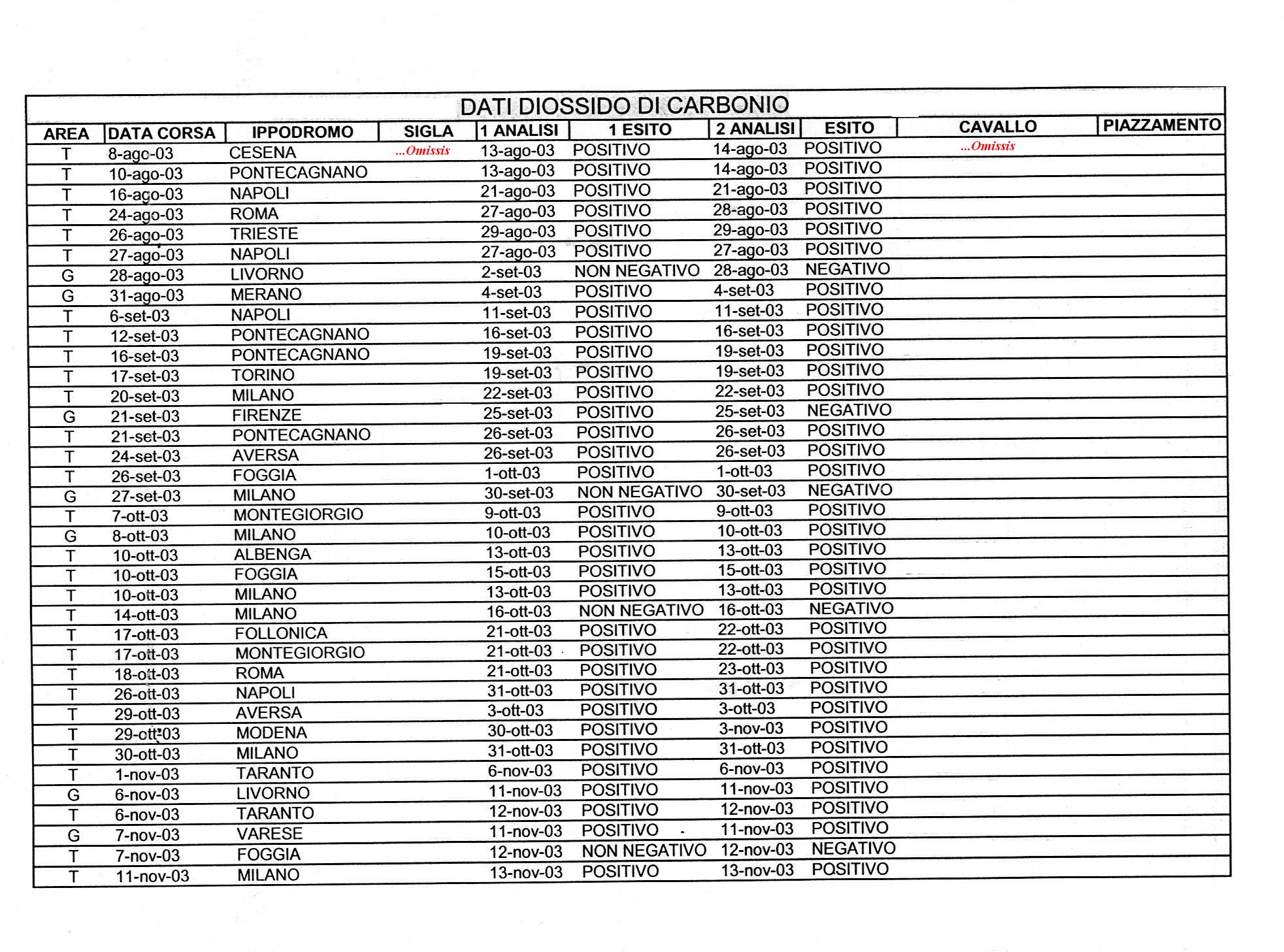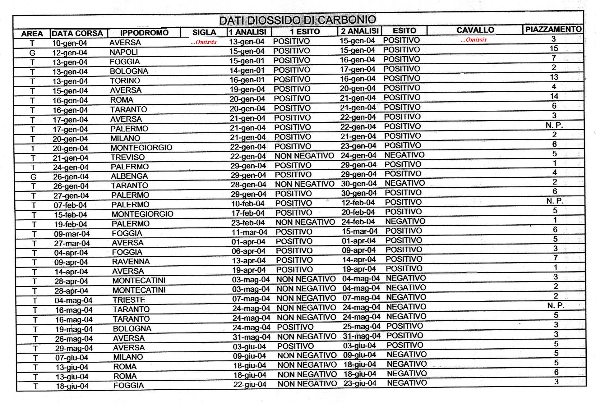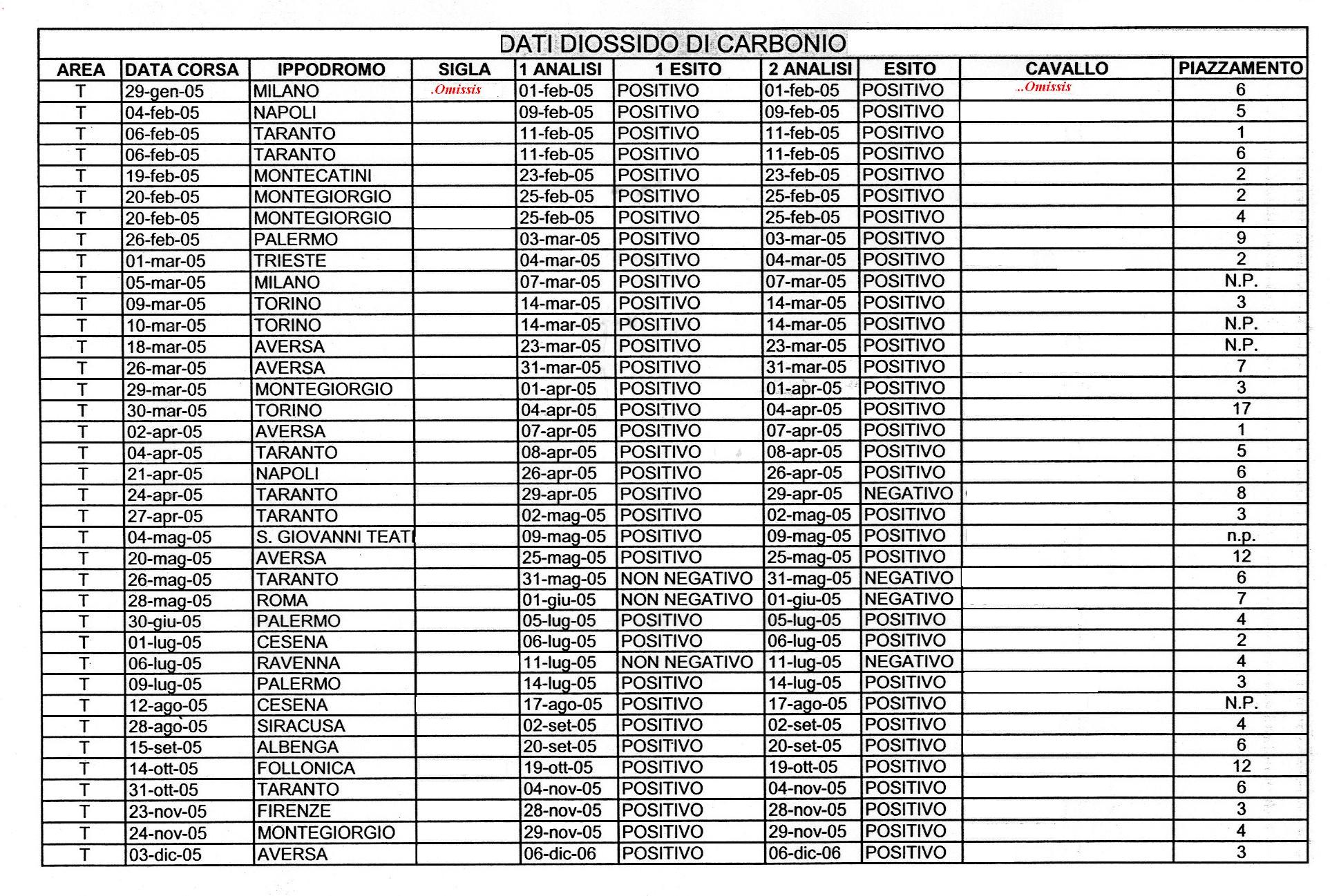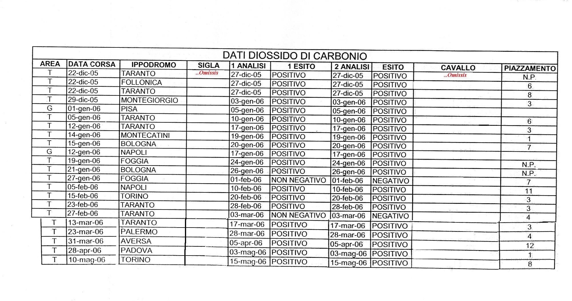 Pubblichiamo, nei file allegati, l'elenco dei casi di positivitą al diossido di carbonio, dal 8 agosto 2003 al 10 maggio 2006. 244 i casi riscontrati, di cui 192 risultati positivi e 52 negativi alle seconde analisi