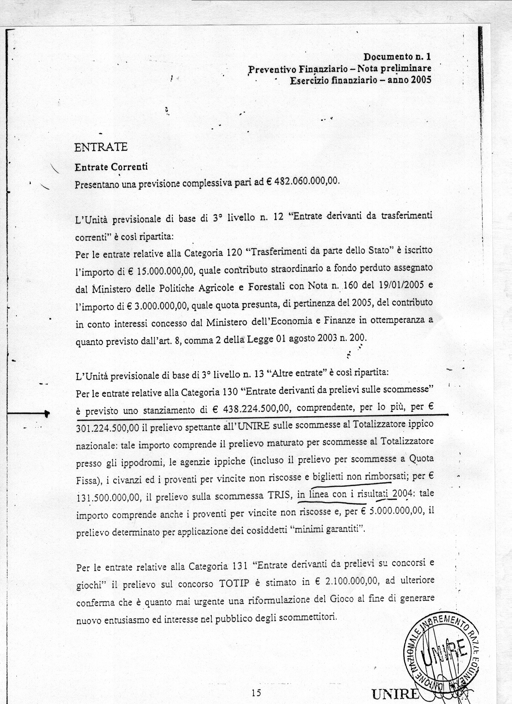 Copia dellla pag. 15 del bilancio di previsione 2005 - nota preliminare - Esercizio finanziario - relativa al paragrafo "Entrate Correnti", con evidenziato il prelievo previsto dalle scommesse 2005.