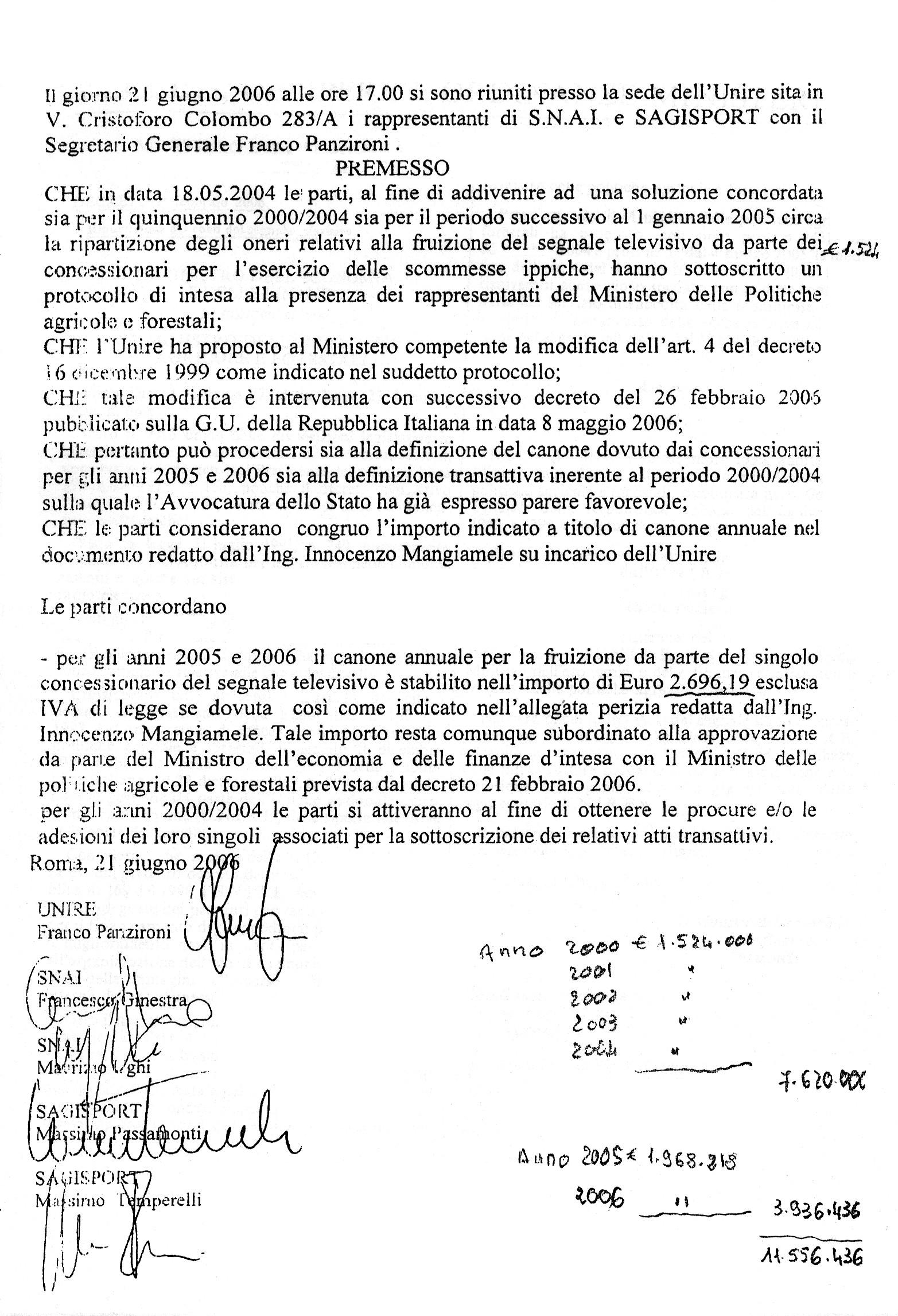 Pubblichiamo, nel file allegato, l'Accordo, sottoscritto il 21 giugno 2006 tra Unire, Snai e Sagisport, con il quale le parti concordano l'ammontare del canone dovuto dai concessionari per la fruizione del segnale televisivo, relativamente al periodo 1 gennaio 2000 - 31 dicembre 2006. |