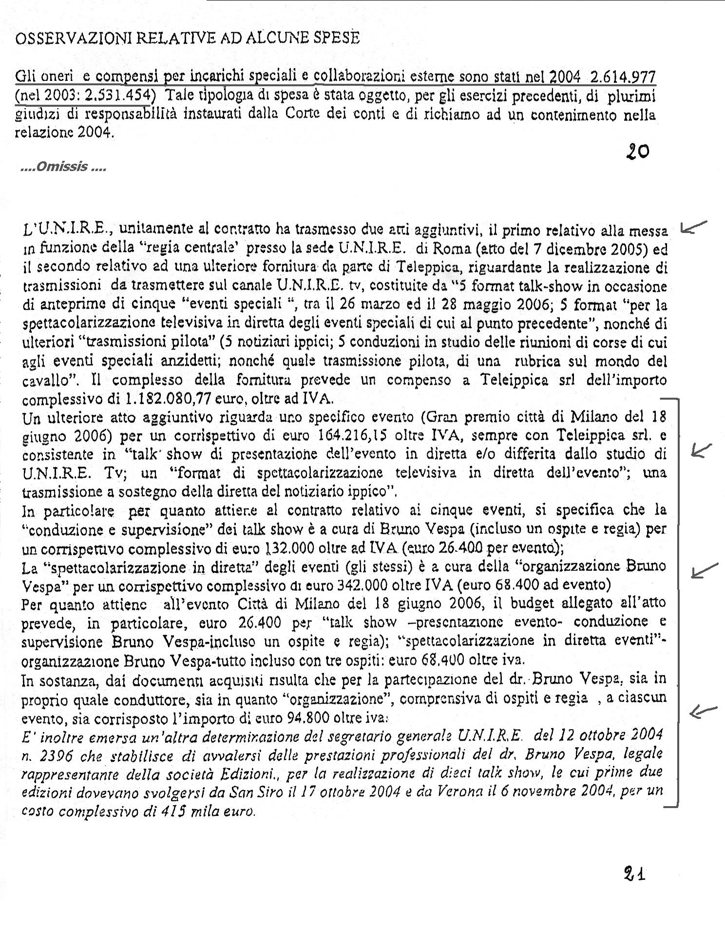 Pubblichiamo, nel file allegato, un estratto della relazione della Commissione Ministeriale dove, nel paragrafo "Osservazioni relative ad alcune spese" viene evidenziata " un' ulteriore ingiustificabile maggiore spesa per alcuni talk show condotti da Bruno Vespa. |