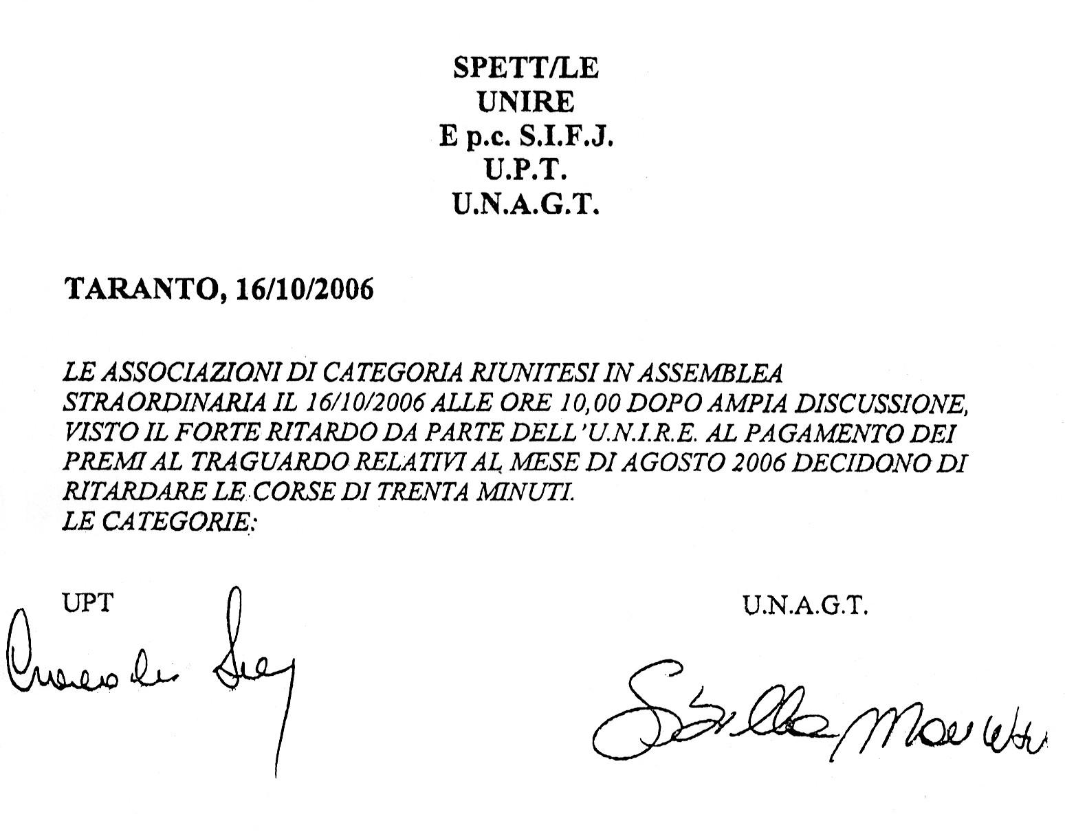 Pubblichiamo, nel file allegato, un comunicato emesso dalle associazioni di categoria Upt e Unagt Taranto con il quale rendono noto che visto il "forte ritardo da parte dell'Unire al pagamento dei premi al traguardo relativi al mese di agosto 2006" decidono, per protesta, di ritardare le corse di 30 minuti. |