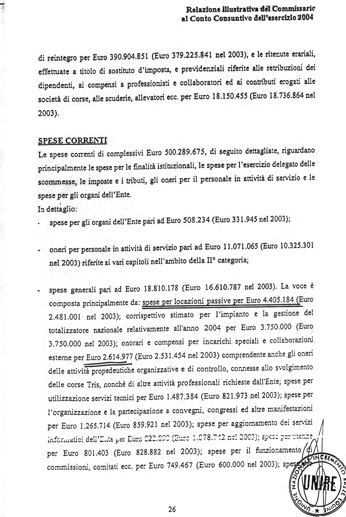 | Pubblichiamo, nel file allegato, un estratto della relazione illustrativa al Conto Consuntivo anno 2004, pag. 26, dove si evidenzia la spesa per locazioni passive per l'anno 2004. |