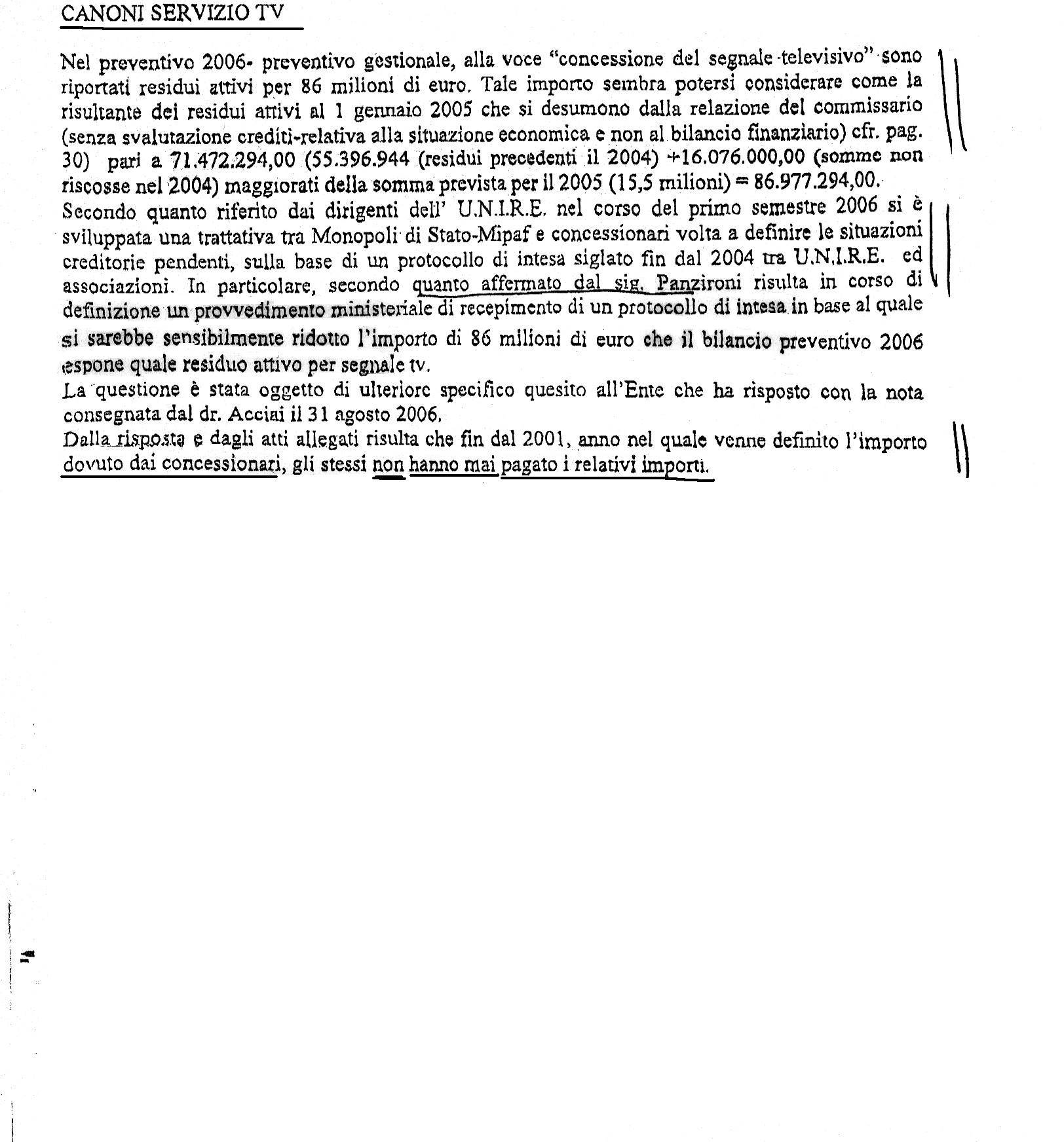 Pubblichiamo, nel file allegato, un estratto della relazione della Commissione Ministeriale dove, nel paragrafo "Canoni servizio Tv" viene evidenziato il credito nei confronti delle agenzie per canoni concessione del segnale televisivo.