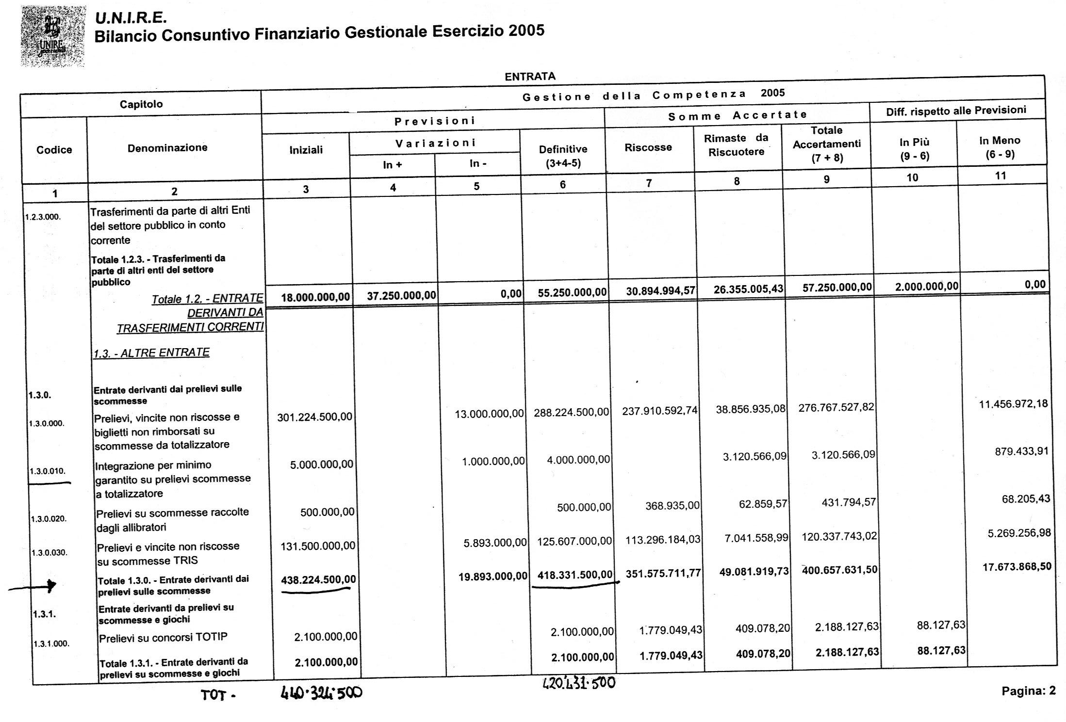 Pubblichiamo, nel file allegato, un estratto del Bilancio Consuntivo Finanziario Gestionale anno 2005, pag. 2, dove si evidenzia l'ammontare delle entrate derivanti dai prelievi sulle scommesse.