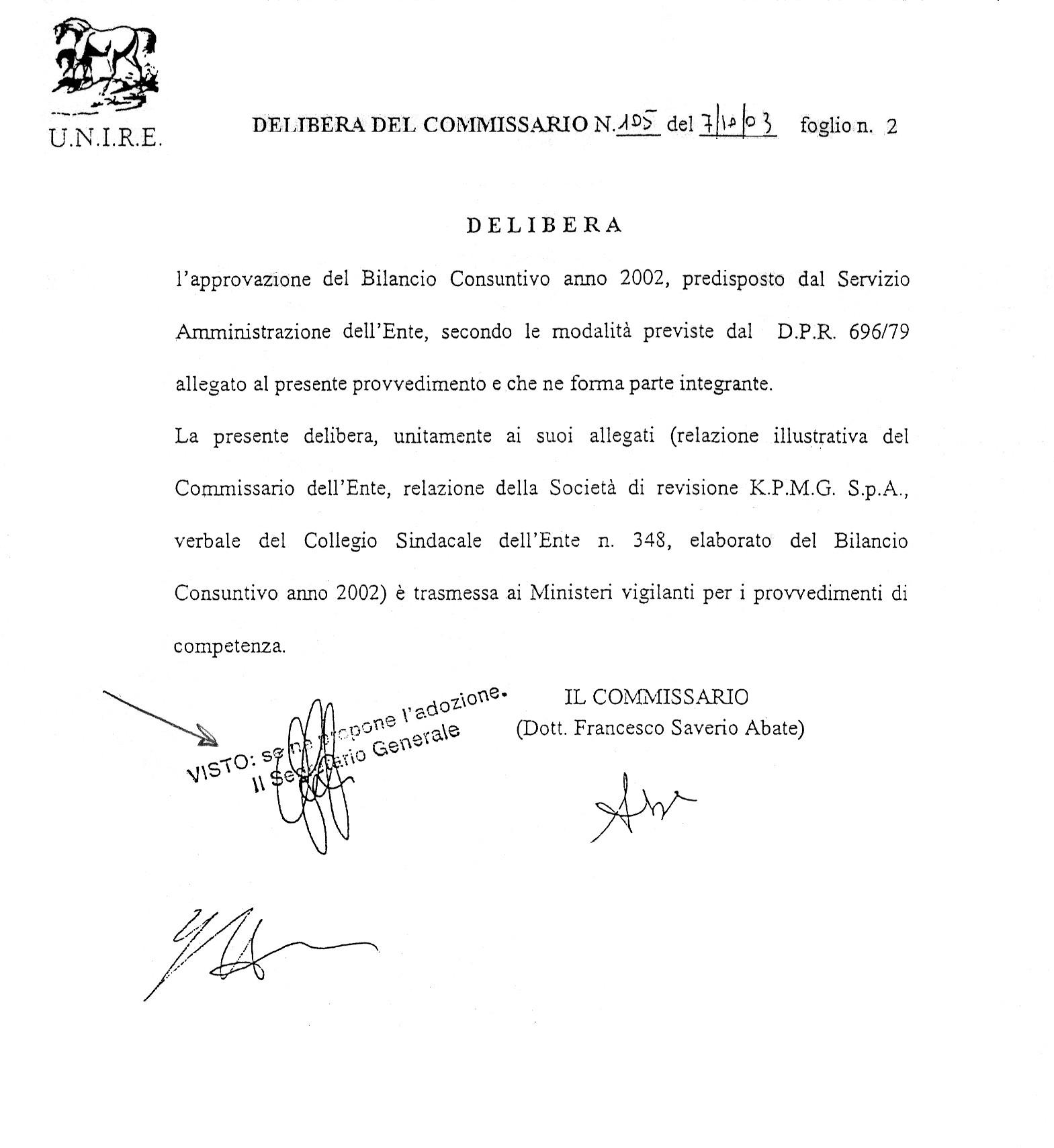 Pubblichiamo, nel file allegato, delibera del Commissario n. 105 del 7/10/03, relativa all'approvazione del Bilancio Consuntivo 2002.