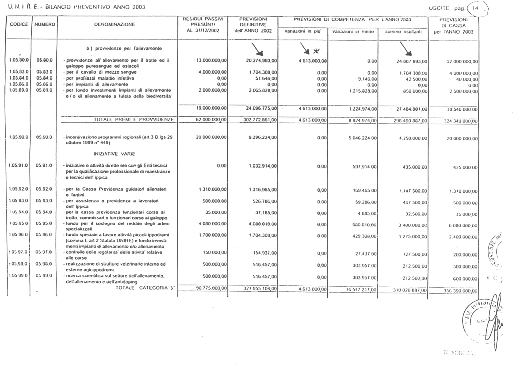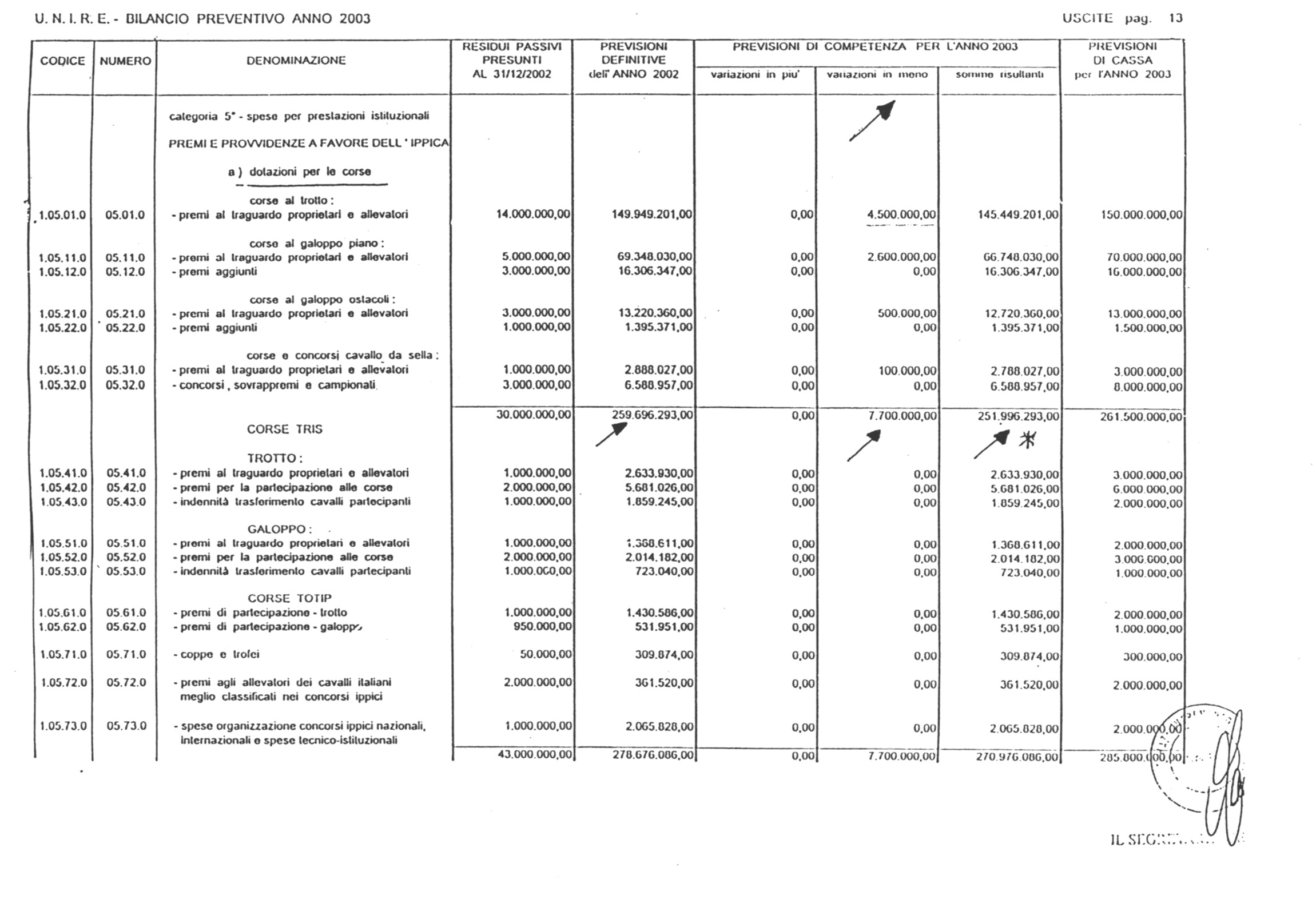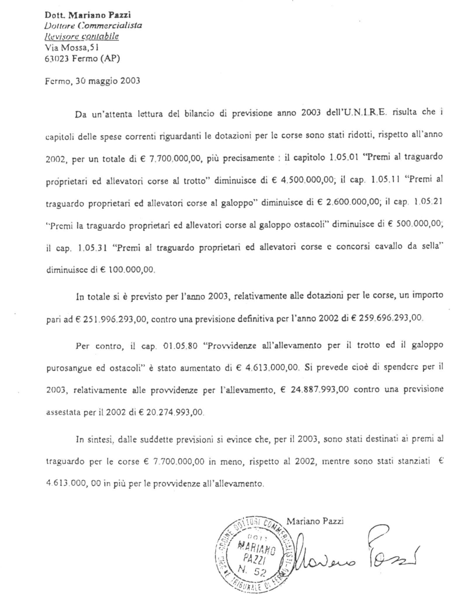 In riferimento alla risposta del Presidente UNAGT alla lettera del signor Gabriele Baldi 23.06.04, alleghiamo: 1. Relazione del dott. Mariano Pazzi, dottore commercialista - revisore contabile, relativa al "Bilancio di Previsione anno 2003 UNIRE"; 2. Copie, tratte dal Bilancio Previsione UNIRE 2003 (del. n.46.03.05). dei capitoli 1.05.01, 1.05.11 e 1.05.31 concernenti, rispettivamente, "Premi al traguardo proprietari e allevatori corse al trotto" diminuito di € 4.500.000, "Premi al traguardo proprietari e allevatori corse al galoppo", diminuito di € 2.600.000 e "Premi al traguardo proprietari proprietari ed allevatori corse al galoppo ed ostacoli", diminuito di € 500.000. Da un'attenta lettura degli allegati del Bilancio di Previsione 2003 (il consuntivo non è stato ancora deliberato) dell'UNIRE, risulta che i capitoli sopraesposti riguardanti le dotazioni delle corse sono stati ridotti, rispetto all'anno 2002, per un totale di € 7.770.000 ; 3. Copia capito 1.5.80 "Provvidenze per all'allevamento per il trotto ed il galoppo purosangue ed ostacoli" aumentato per il 2003 di € 4.613.000,00. Si è previsto cioè di spendere per il 2003, relativamente alle provvidenze per l'allevamento, € 24.887.993,00 contro una previsione assestata per il 2002 di € 20.274.993,00; 4. Copia, tratta dal Bilancio Preventivo UNIRE 2004 ( del.n. 4 del 19.02.04), della "Tabella Dimostativa dell'Avanzo di Amministrazione Presunto 2003", in cui si evidenzia una riduzione di € 80 milioni di euro di residui attivi 2003. U.N.A.G.T., FEDERTROTTO, U.P.T. hanno ufficialmente richiesto un incontro all'UNIRE ( non ricevendo mai risposta) per sapere se questa riduzione fosse un assestamento conseguente al lodo arbitrale 26.5.03 che ha condannato Ministeri dell'economia eil Ministero per le Politiche Agricole (responsabili di denunciati ritardi e/o inadempimenti nei confronti di 171 agenzie) ad un risarcimento del danno nei confronti dei concessionari. Si tratterebbe dell'ennesima attribuzione sulle spalle degli operatori degli inadempimenti altrui. Infatti all'UNIRE vanno per legge (art. 12 D.P.R. 169/98) gli introiti delle scommesse sulle corse dei cavalli: se, per una deliberazione arbitrale rituale- e quindi avente forza di sentenza- i Ministeri sono stati condannati ad un risarcimento del danno per prorie inadempienze, ciò non può intaccare l'introiti dei minimi garantiti, i quali debbono essere sempre e comunque pagati. |