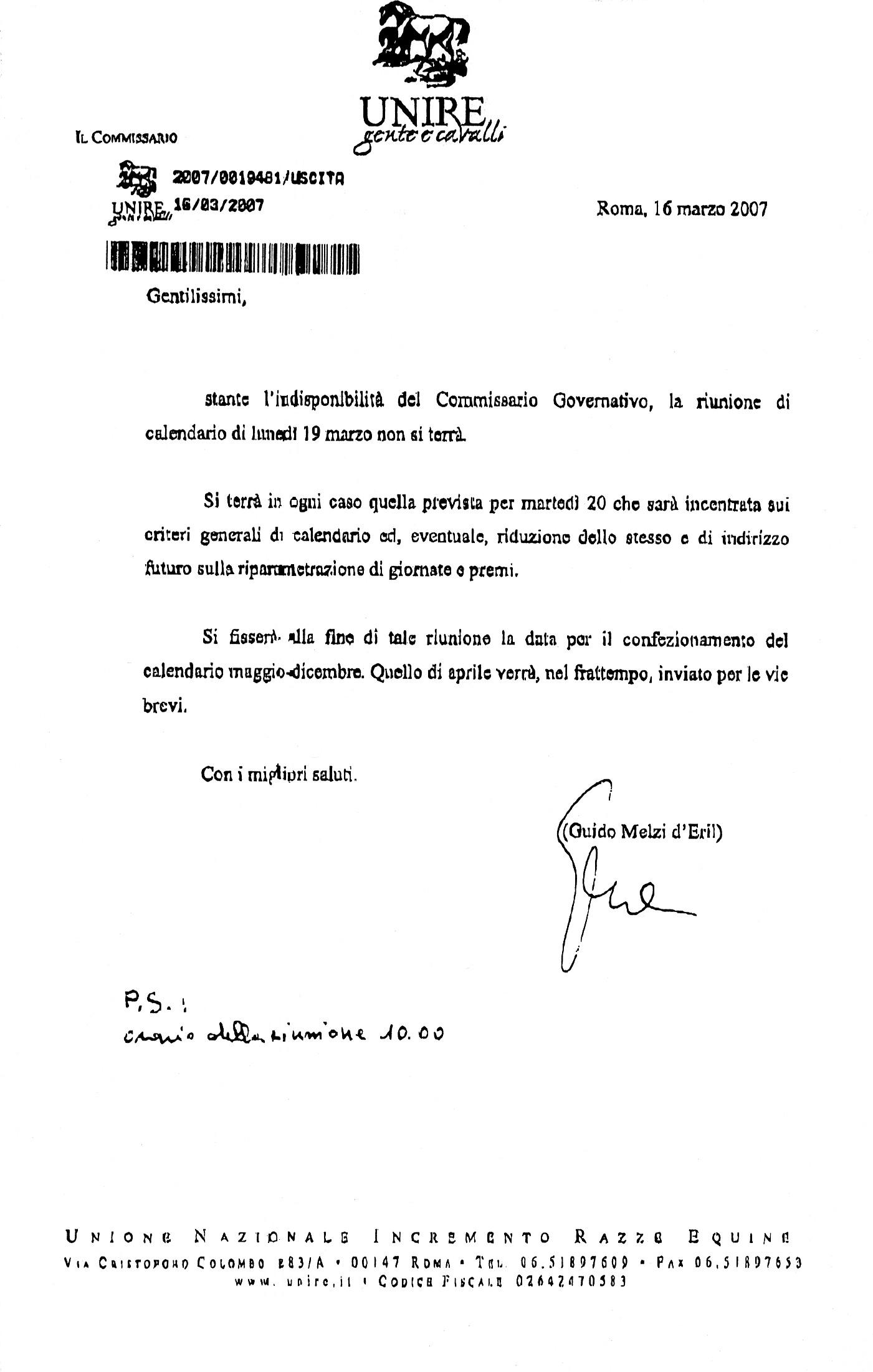 Pubblichiamo, nel file allegato, nota n. 19481 del 16.3.07, trasmessa dal Commissario Unire Guido Melzi alle Società di corse con la quale si annulla la prevista riunione per lunedì 19 marzo p.v.