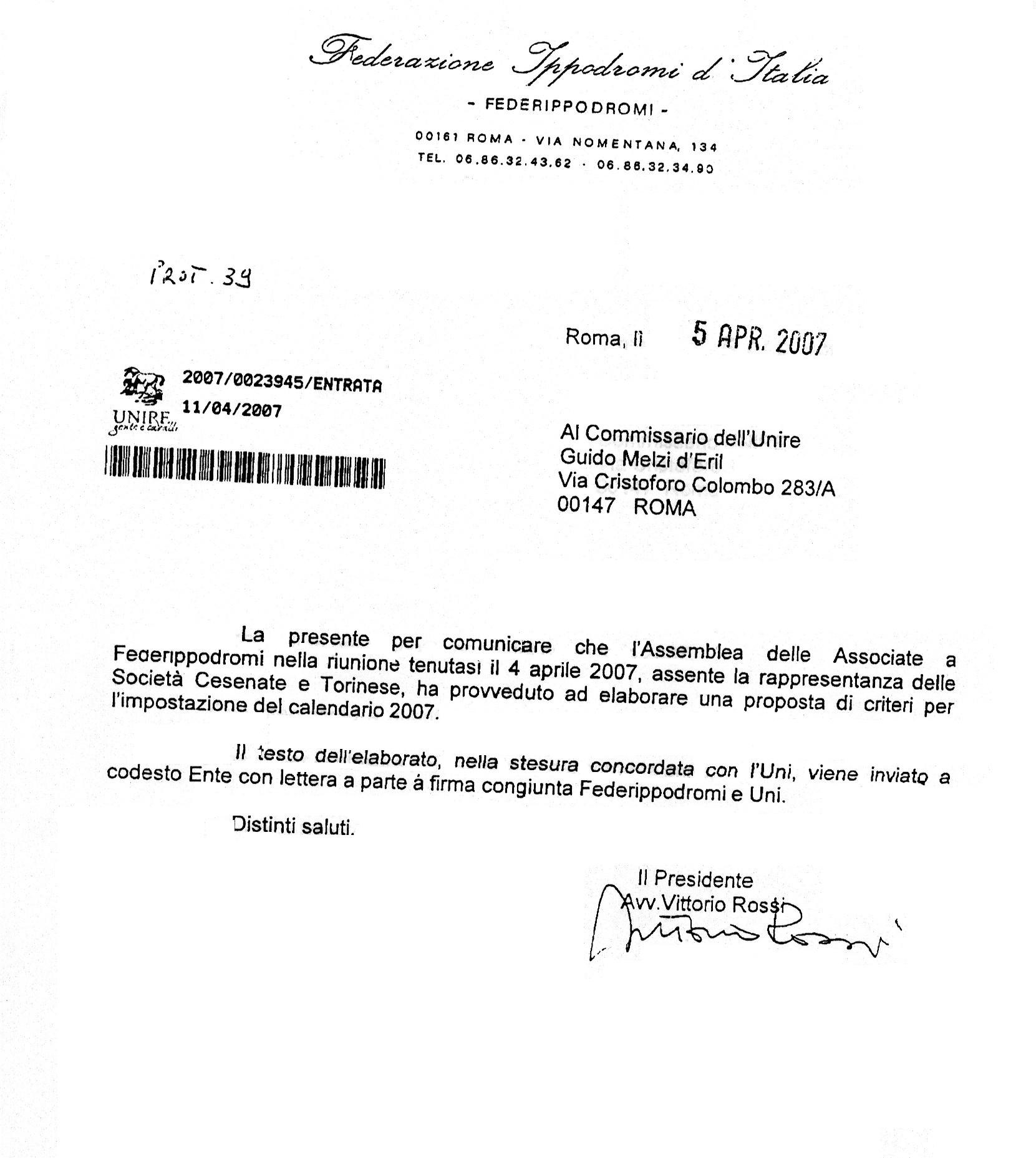 Pubblichiamo, nei files allegati, missiva 5.4.2007 trasmessa all'Ente con allegati i criteri base proposti da Federippodromi e Uni (Unione che rappresenta, tra gli altri, anche Ippodromi e Cittą, societą di cui č Presidente il dott. Gaetano Papalia, presidente anche di Uni) per la stesura del calendario 2007. |