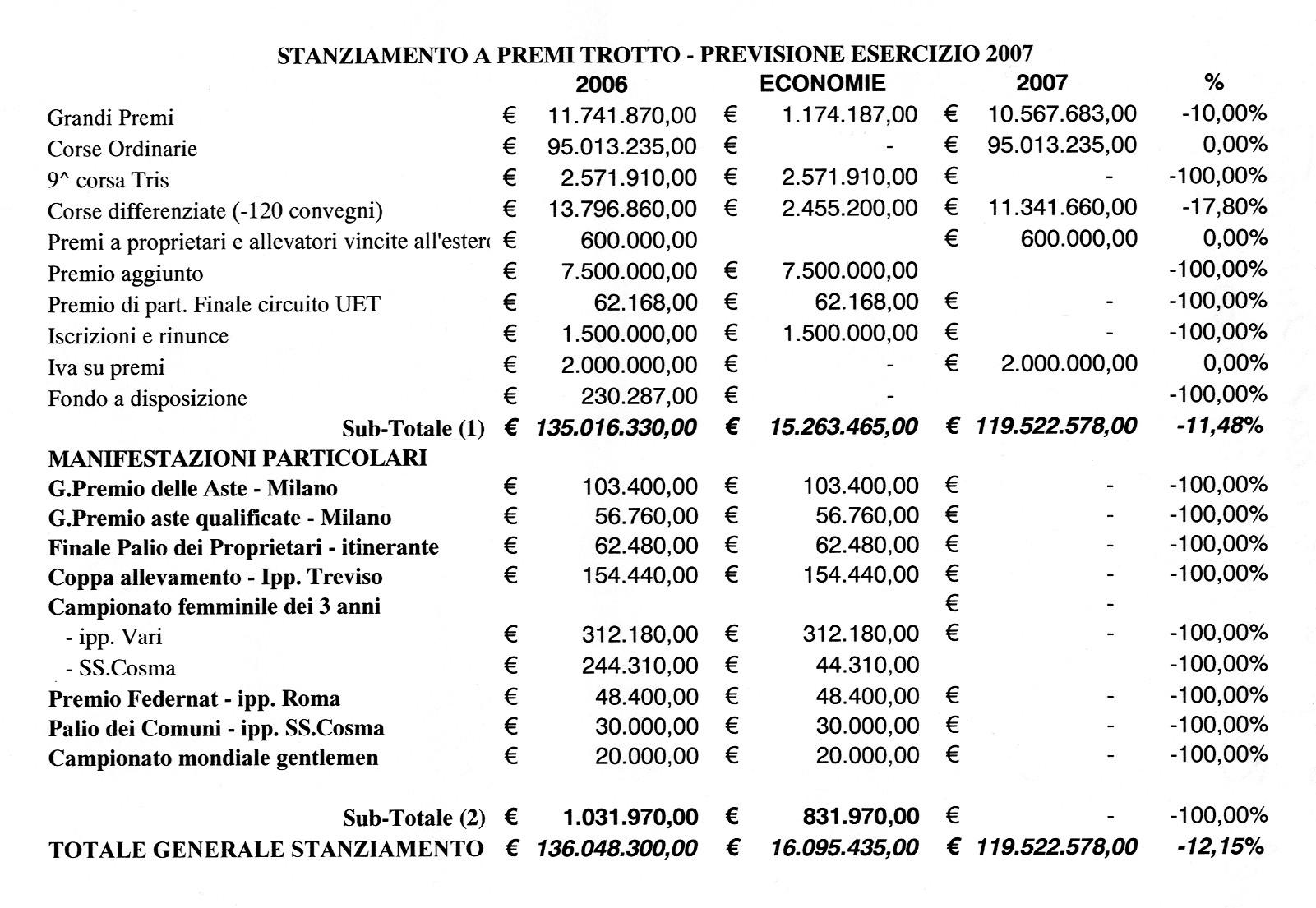 Pubblichiamo, nel file allegato, lo stanziamento a premi trotto esercizio 2007, presentato dall'Unire alle categorie nel novembre 2006 e riportato nel bilancio di previsione 2007. Come si nota nel prospetto il montepremi ordinario nel 2007 rimane invariato rispetto il 2006. |