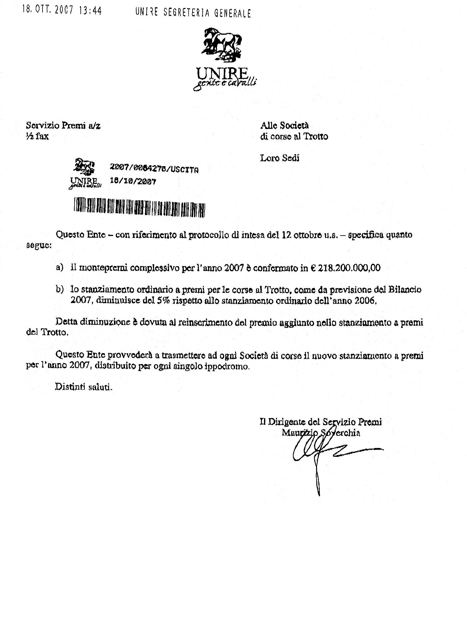 Allegati per Prima pagina: Nota Unire alle societą di corse al trotto 18.10.07