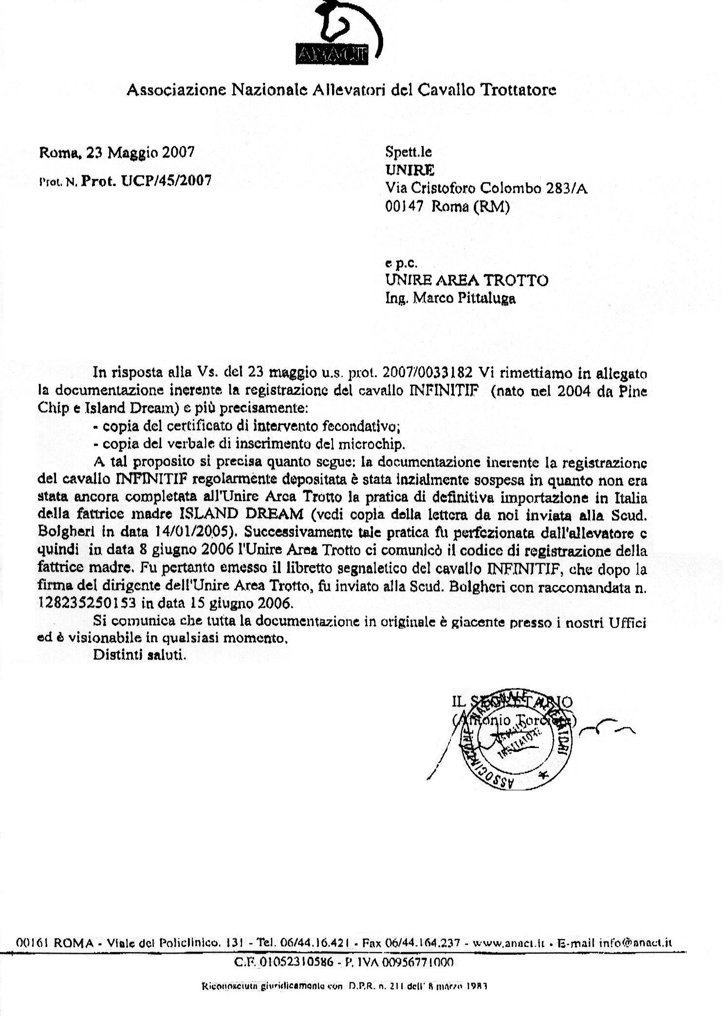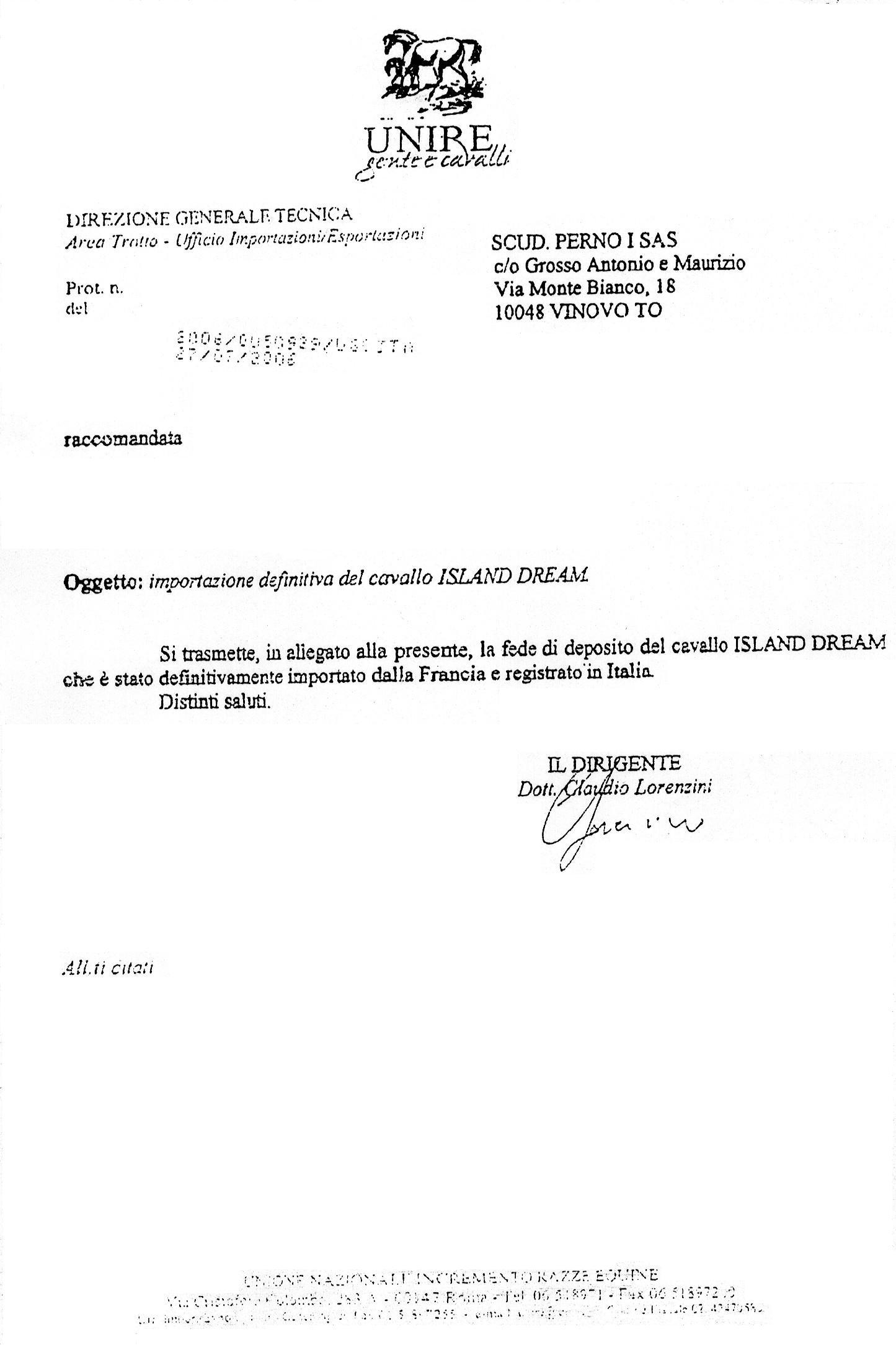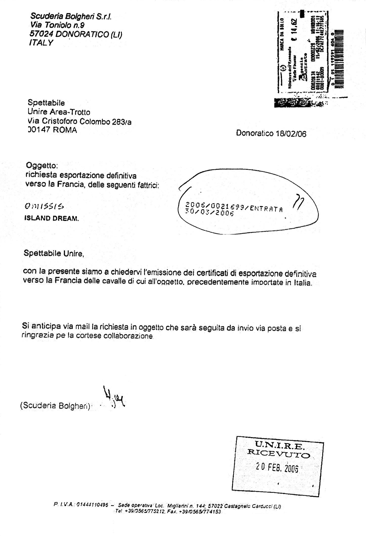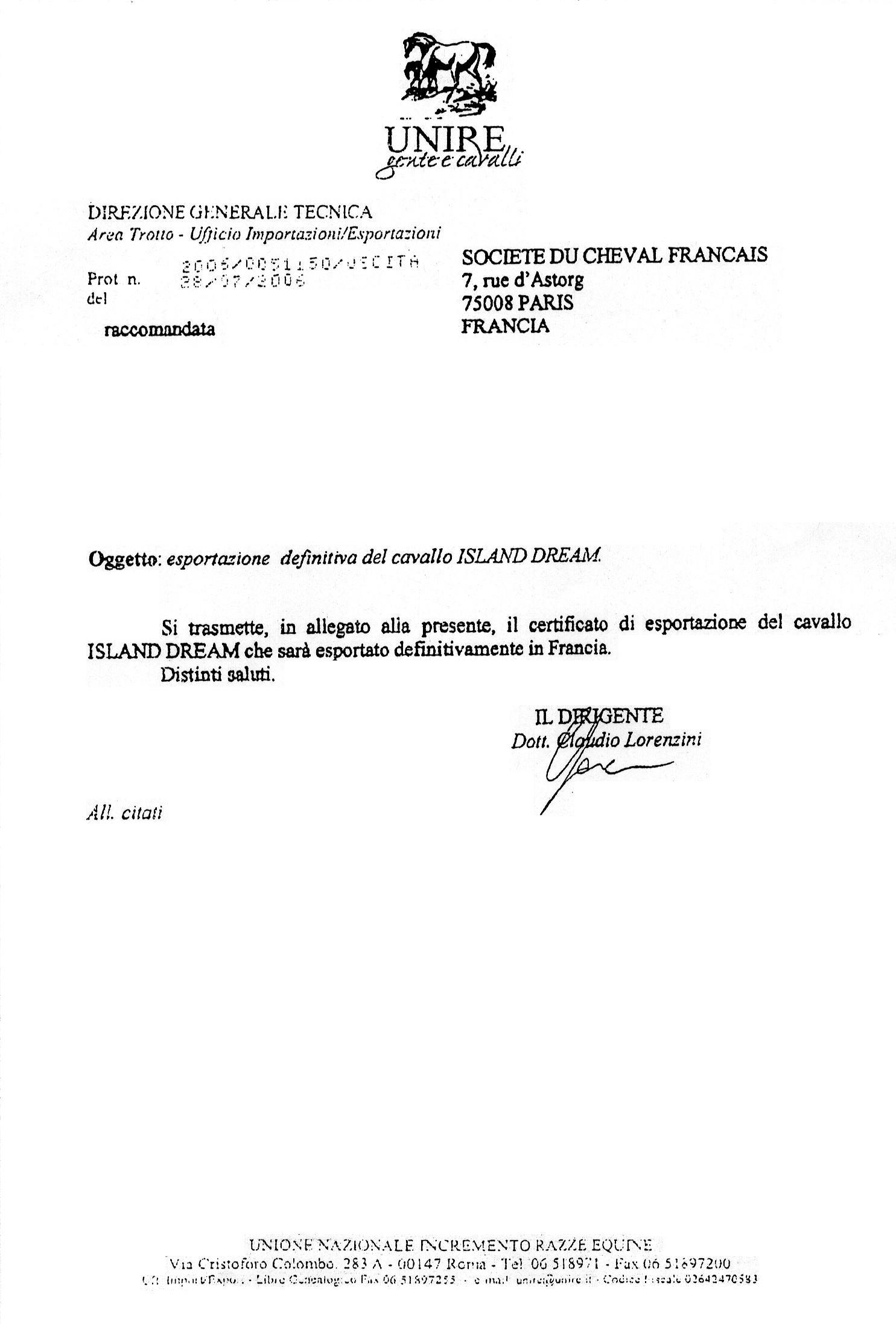 SEGUE LA PUBBLICAZIONE, NEI FILES ALLEGATI, DEI DOCUMENTI, RELATIVI AL CASO INFINITIF: 1) STAMPA DEI PRODOTTI DELLA FATTRICE ISLAND DREAM; 2) CERTIFICATO DI ESPORTAZIONE DEFINITIVA DALLA FRANCIA FATTRICE ISLAND DREAM 9.2.06 APPARTENENTE A J.P.DUBOIS E NON ALLA SC. BOLGHERI SAS; 3) RICHIESTA DELLA SC. BOLGHERI SRL DI ESPORTAZIONE DEFINITIVA VERSO LA FRANCIA ISLAND DREAM 18.2.06; 4) MEDESIMA RICHIESTA DI CUI AL PUNTO 3, MA CON DIVERSI PROTOCOLLI DI ENTRATA UNIRE; 5) MISSIVA ANACT - UNIRE INERENTE LA REGISTRAZIONE DI INFINITIF 23.5.07; 6) CERTIFICATO ESPORTAZIONE DEFINITIVA VERSO LA FRANCIA CAVALLA ISLAND DREAM 24.7.06, 7) COMUNICAZIONE UNIRE - SOC. DU CHEVAL FRANCAIS ESPOSRTAZIONE DEFINITIVA ISLAND DREAM 28.7.06; 8) ESTRATTO BANCA DATI UNIRE REGISTRAZIONE PASSAGGIO CAVALLA ISLAND DREAM; 9) ESTRATTO BANCA DATI UNIRE REGISTRAZIONE PASSAGGIO CAVALLO INFINITIF; 10) COMUNICAZIONE UNIRE DI CLAUDIO LORENZINI DI IMPORTAZIONE DEFINITIVA CAVALLO ISLAND DREAM 27.7.06. |