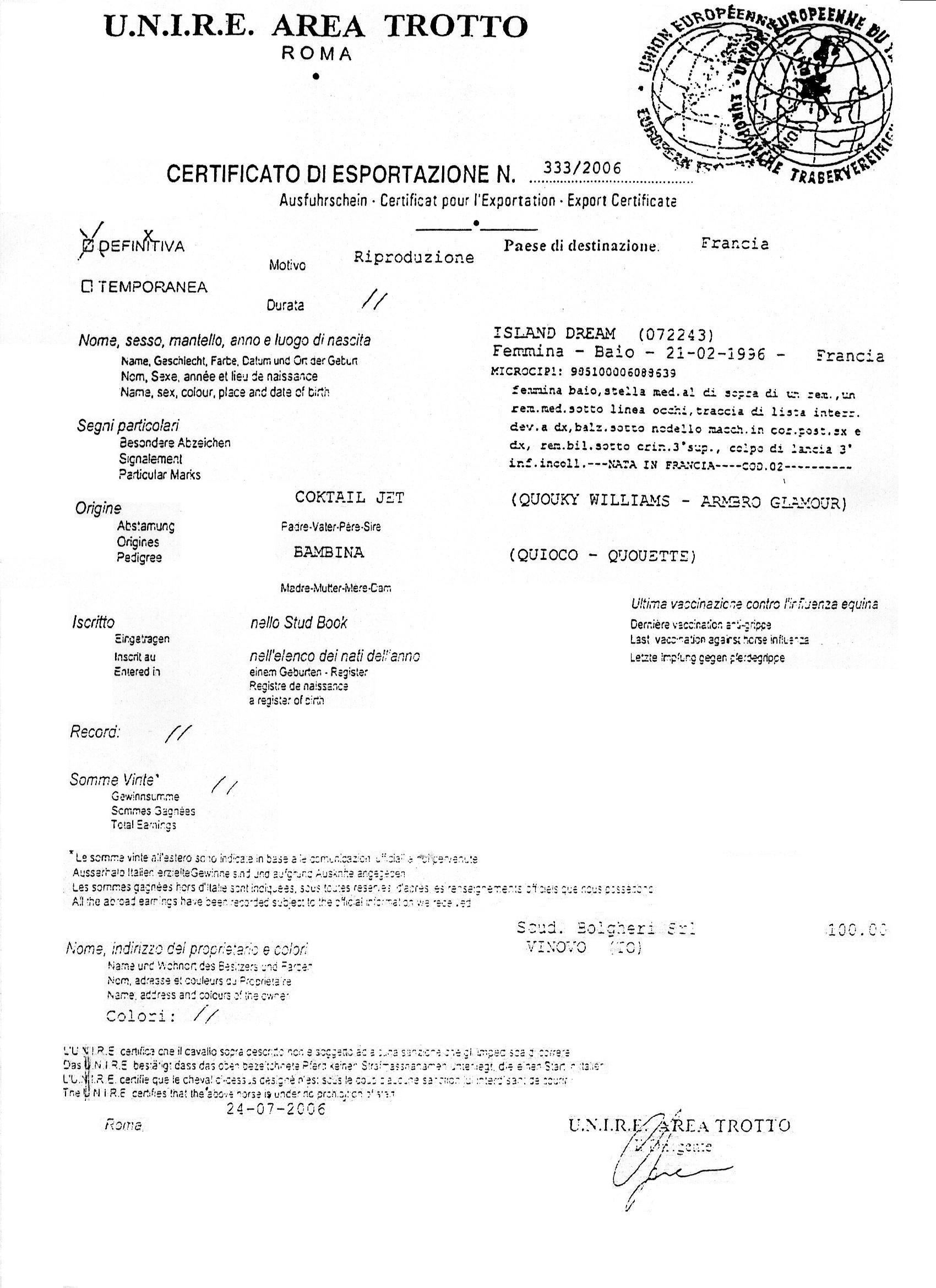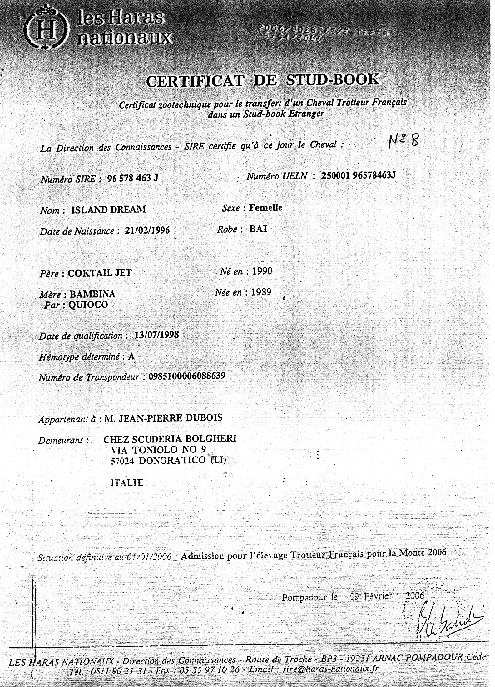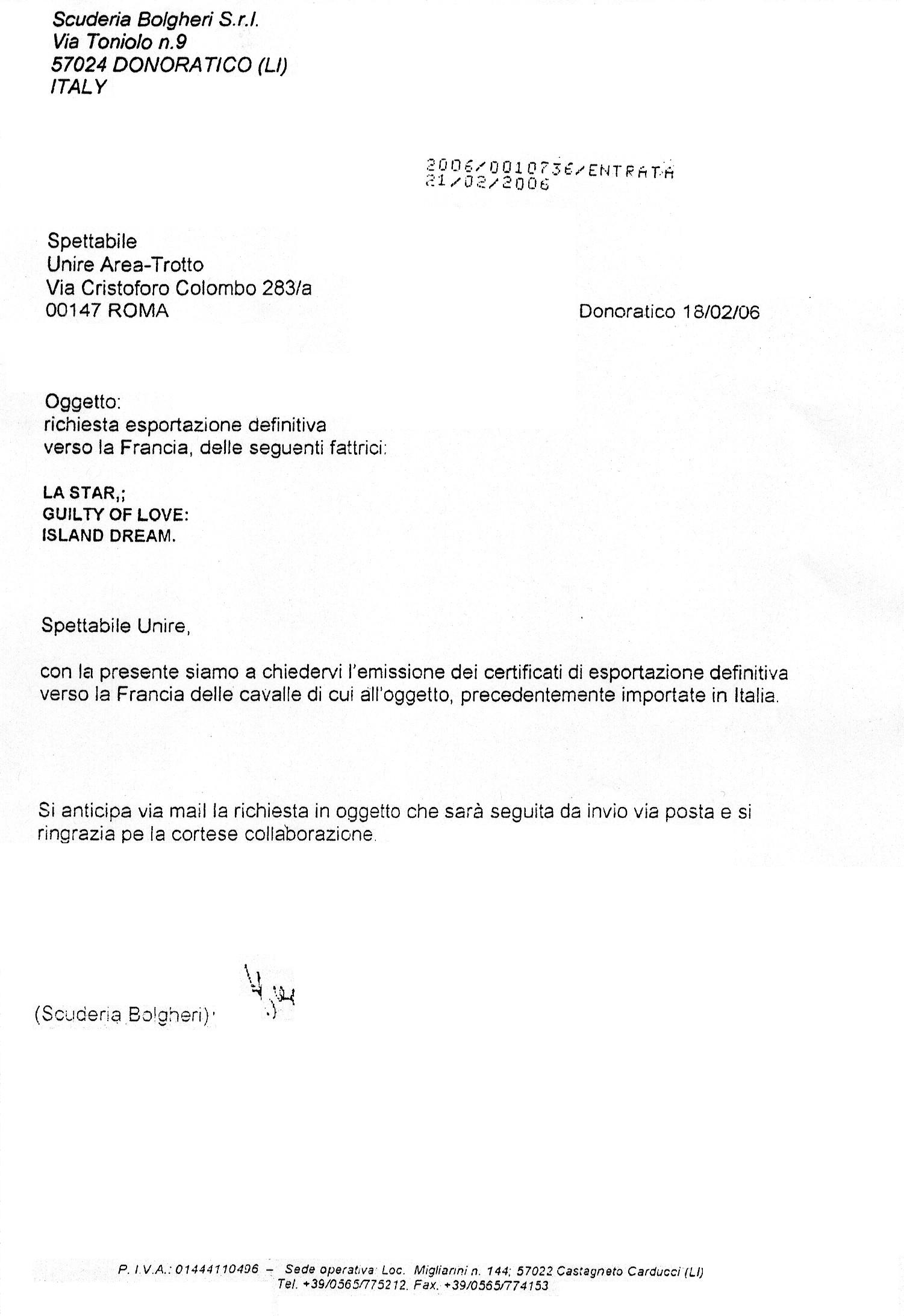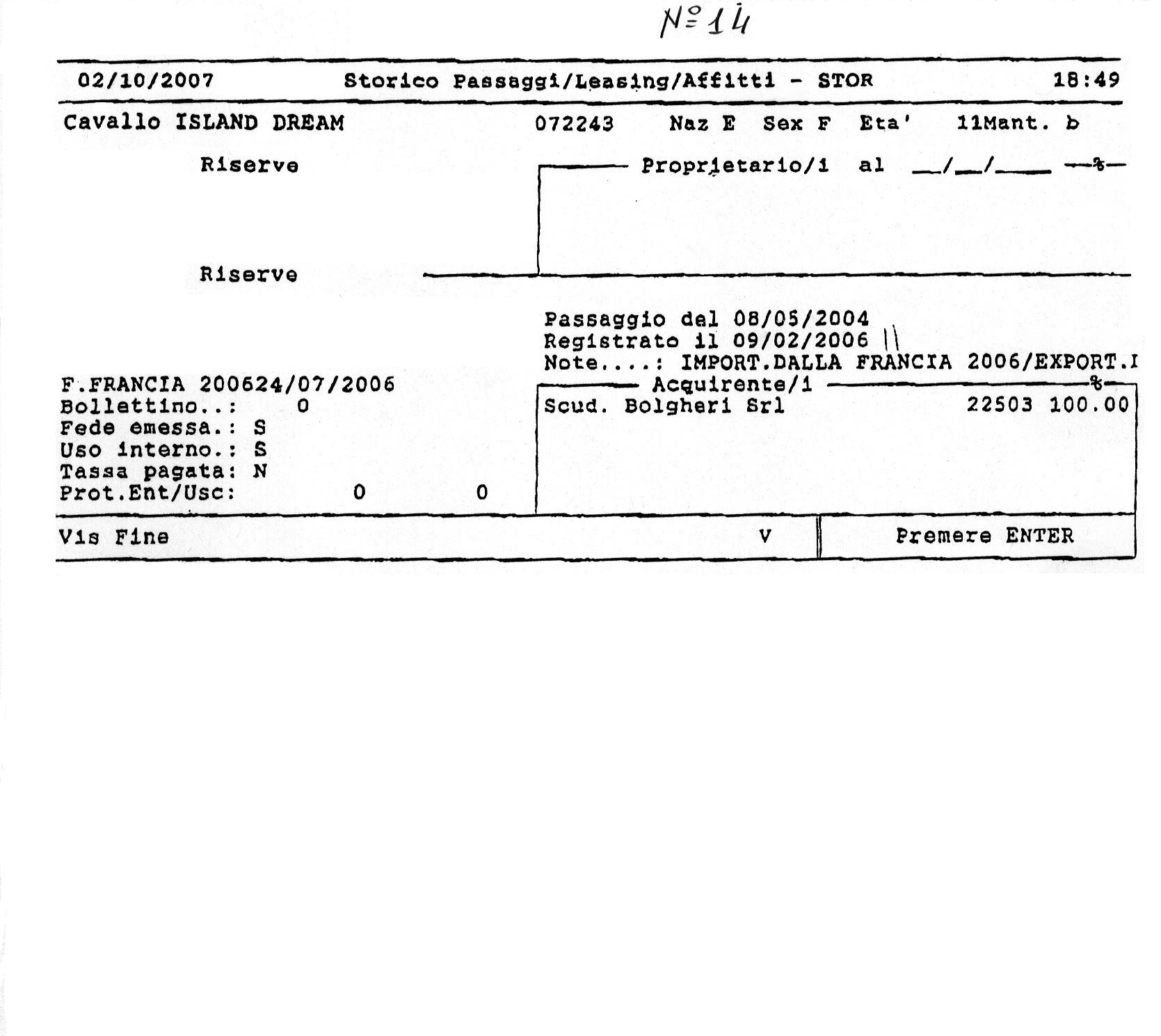 SEGUE LA PUBBLICAZIONE, NEI FILES ALLEGATI, DEI DOCUMENTI, RELATIVI AL CASO INFINITIF: 1) STAMPA DEI PRODOTTI DELLA FATTRICE ISLAND DREAM; 2) CERTIFICATO DI ESPORTAZIONE DEFINITIVA DALLA FRANCIA FATTRICE ISLAND DREAM 9.2.06 APPARTENENTE A J.P.DUBOIS E NON ALLA SC. BOLGHERI SAS; 3) RICHIESTA DELLA SC. BOLGHERI SRL DI ESPORTAZIONE DEFINITIVA VERSO LA FRANCIA ISLAND DREAM 18.2.06; 4) MEDESIMA RICHIESTA DI CUI AL PUNTO 3, MA CON DIVERSI PROTOCOLLI DI ENTRATA UNIRE; 5) MISSIVA ANACT - UNIRE INERENTE LA REGISTRAZIONE DI INFINITIF 23.5.07; 6) CERTIFICATO ESPORTAZIONE DEFINITIVA VERSO LA FRANCIA CAVALLA ISLAND DREAM 24.7.06, 7) COMUNICAZIONE UNIRE - SOC. DU CHEVAL FRANCAIS ESPOSRTAZIONE DEFINITIVA ISLAND DREAM 28.7.06; 8) ESTRATTO BANCA DATI UNIRE REGISTRAZIONE PASSAGGIO CAVALLA ISLAND DREAM; 9) ESTRATTO BANCA DATI UNIRE REGISTRAZIONE PASSAGGIO CAVALLO INFINITIF; 10) COMUNICAZIONE UNIRE DI CLAUDIO LORENZINI DI IMPORTAZIONE DEFINITIVA CAVALLO ISLAND DREAM 27.7.06. |