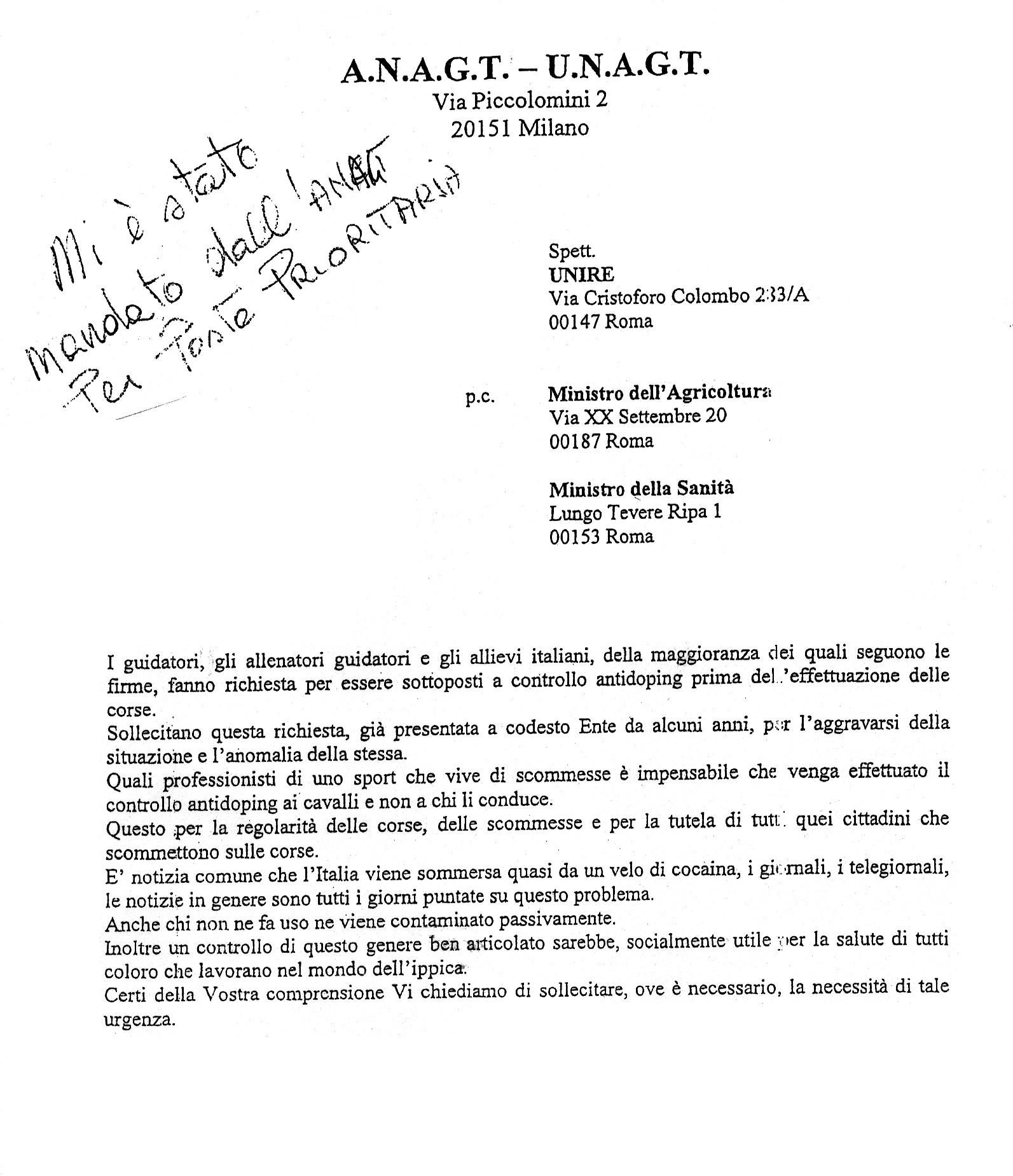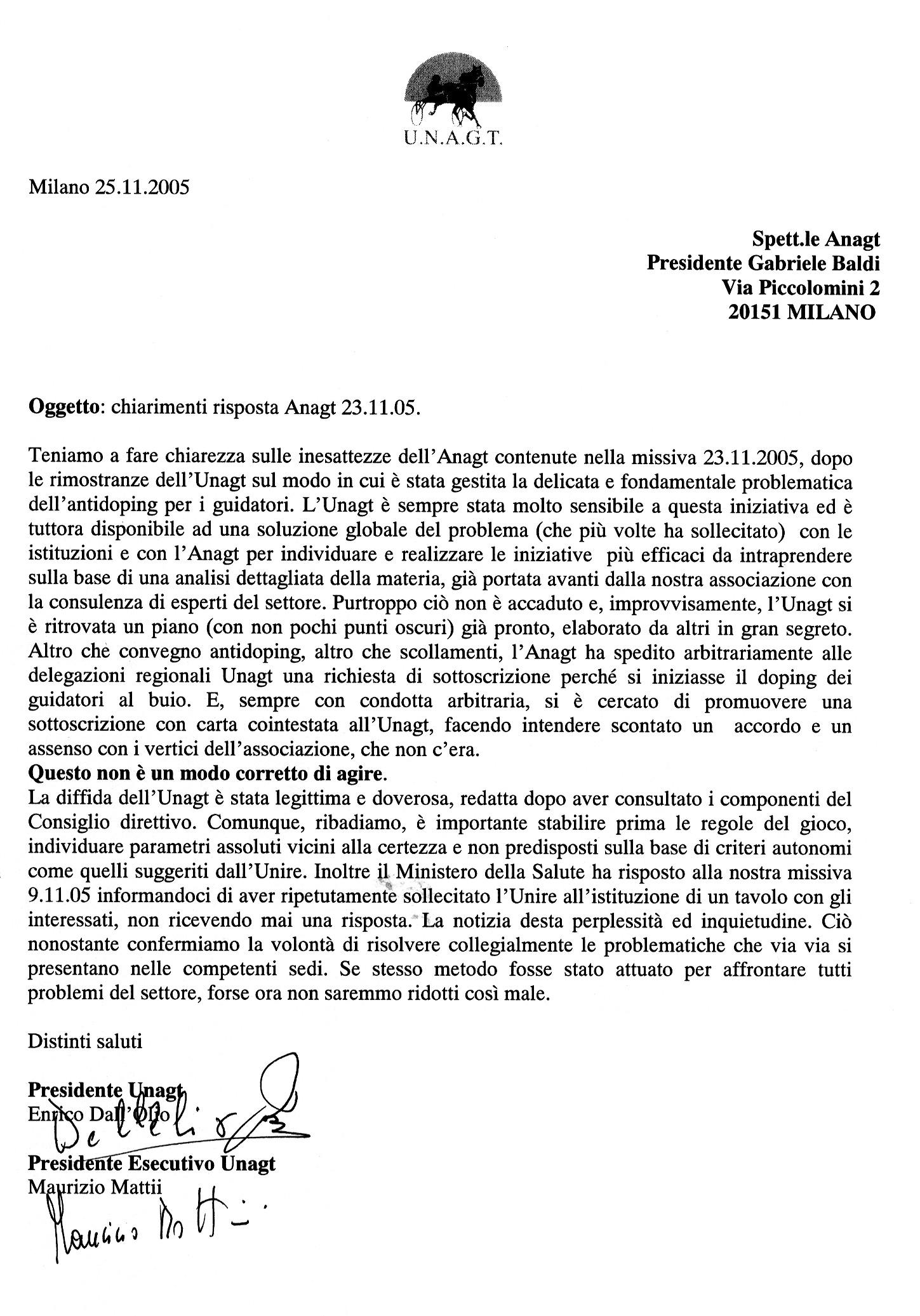 Pubblichiamo, nei file allegati, la cronistoria delle posizioni Anagt/Unagt in merito all'istituzione delcontrollo doping guidatori: 1) Richiesta di raccolta firme, trasmessa arbitrariamente dall'Anagt a tutte le delegazioni Unagt senza una preventiva concertazione con i vertici Unagt; 2) Missiva Unagt trasmessa all'Unire ed ai Ministeri competenti in merito ai prelievi doping allenatori, guidatori ed allievi trotto; 3) Lettera di chiarimento trasmessa al presidente Anagt - Gabriele Baldi in data 23.11.05. |