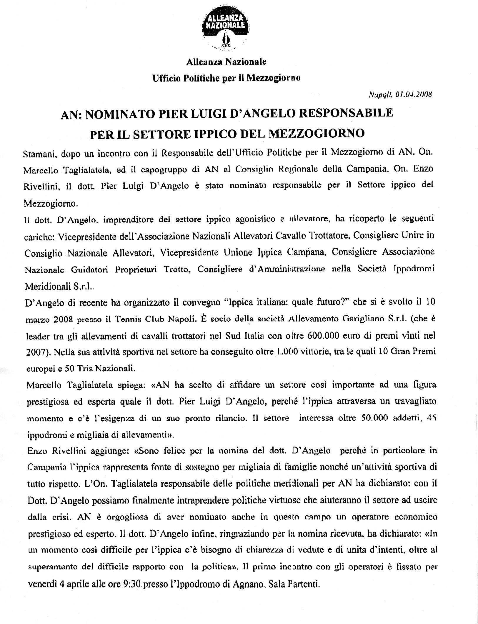 Pubblichiamo, nel file allegato, nomina a responsabile AN per il settore ippico del mezzogiorno del sig. Pier Luigi D'Angelo