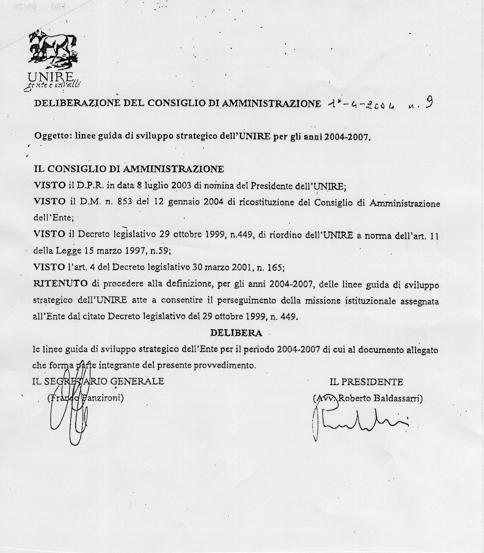 Atti amministrativi: Del. CDA n. 9 del 01.04.04: Linee guida di sviluppo strategico dell'UNIRE per gli anni 2004-2007
