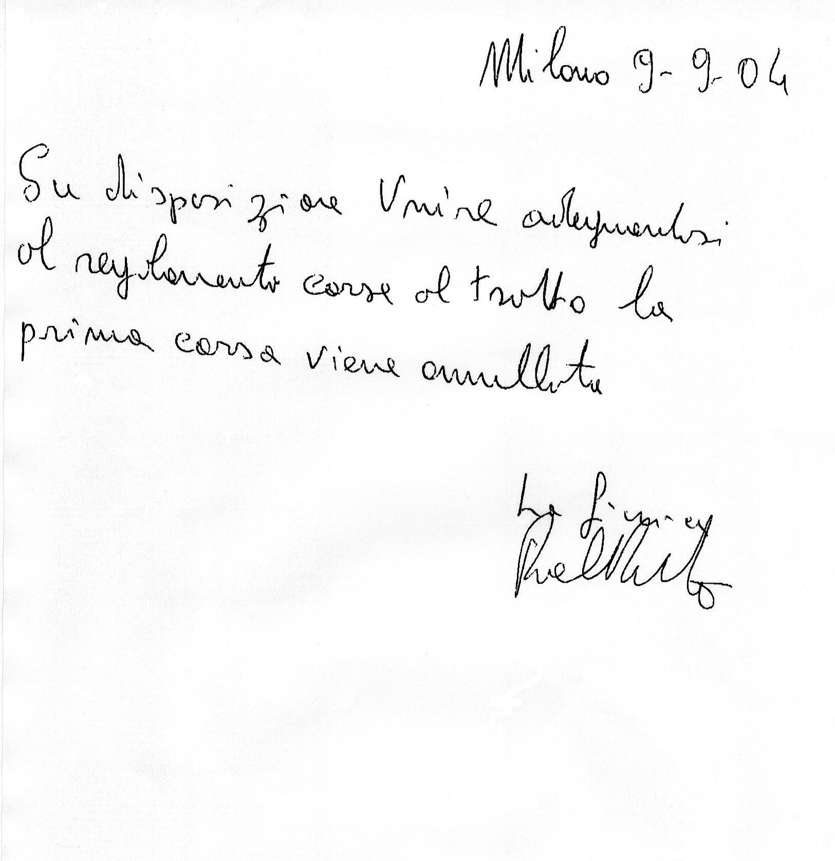 Riportiamo, nel file allegato, la decisione della Giuria di Milano del 10.09.04 in merito all'annullamento della 1° corsa in programma.
