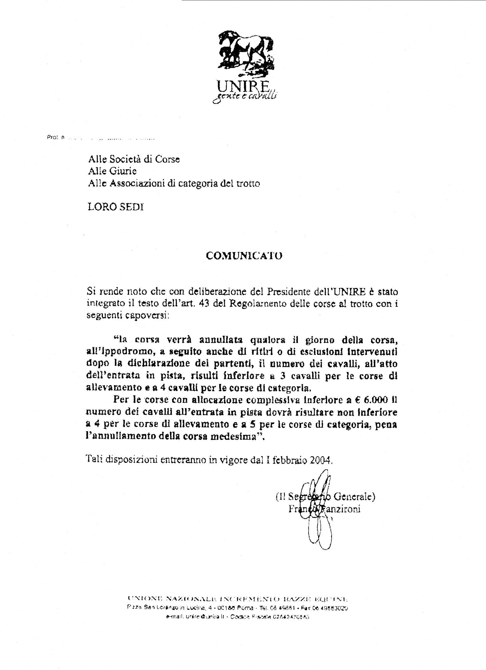 Pubblichiamo, nel file allegato, il comunicato del Segretario Generale Unire con il quale rende noto che con deliberazione del Presidente dell'Unire è stato integrato il testo dell'art. 43 del Regolamento delle corse al trotto. Le disposizioni contenute andranno in vigore dal 01 febbraio 2004 |