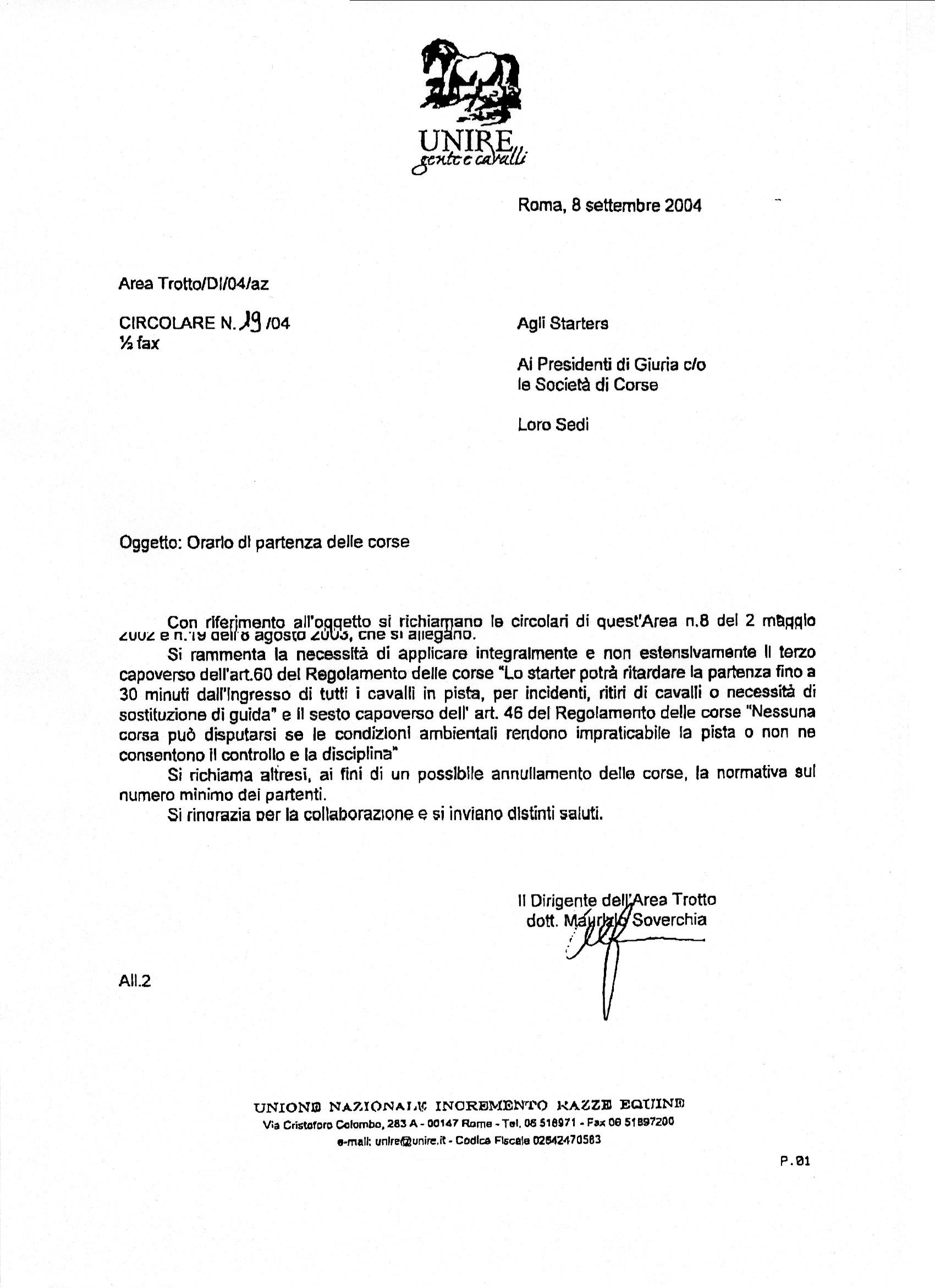 Pubblichiamo, nel file allegato, la circolare Unire Area Trotto n. 19 del 8 settembre 2004 relativa all'orario di partenza delle corse.