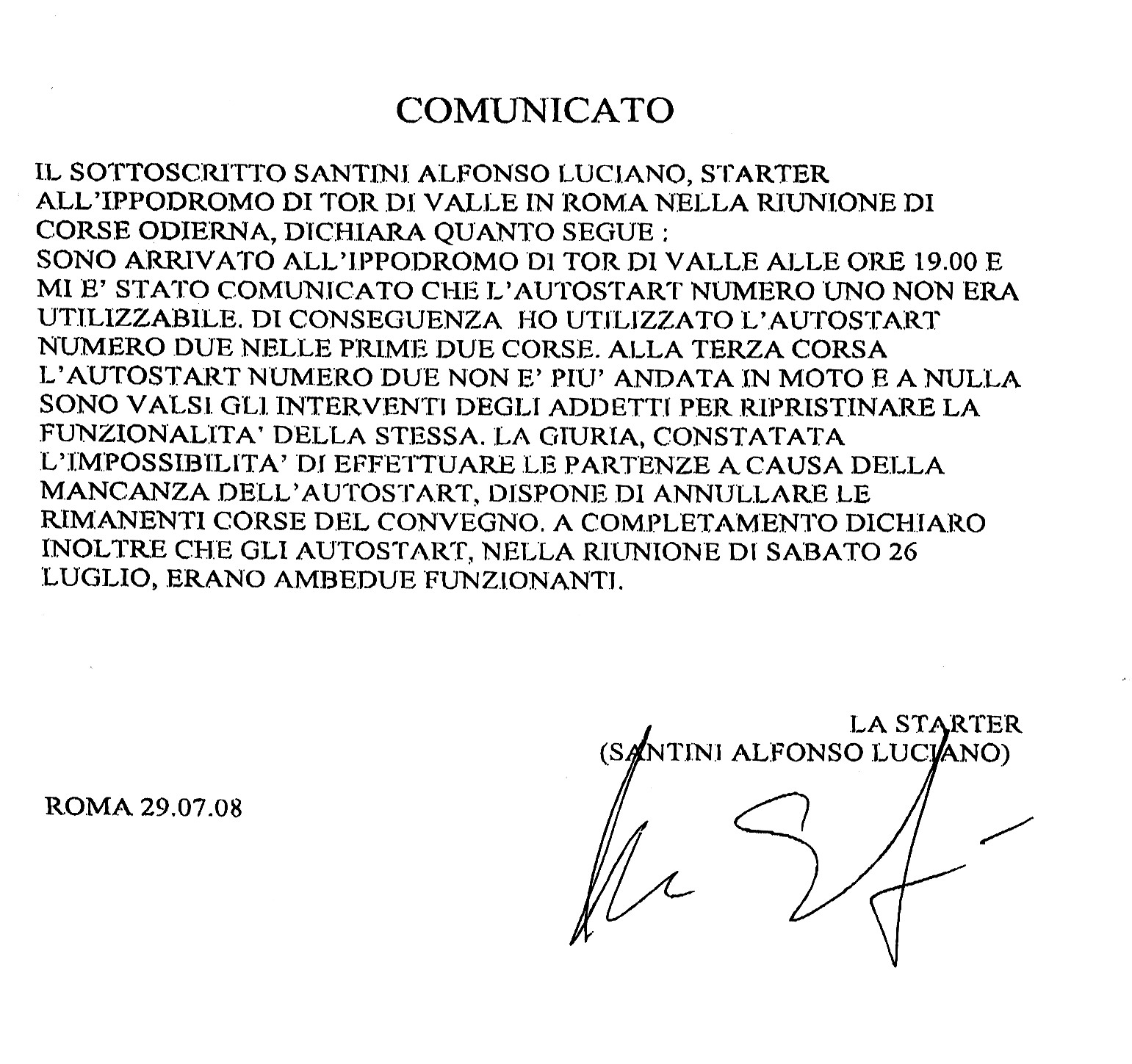 Pubblichiamo, nel file allegato, comunicato dello starter Luciano Santini in merito all'annullamento del convegno di Tor di Valle del 29.7.08 per "non funzionamento di entrambi gli starter".